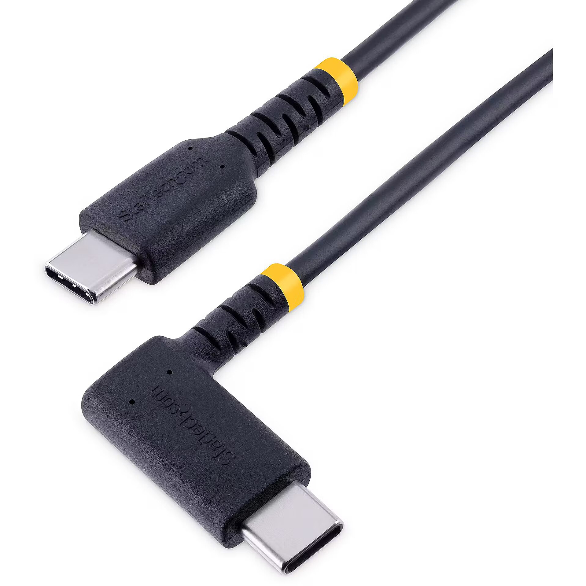 LongDesc - Connect and charge USB Type-C devices with a rugged right-angle cableThis rugged 6in (15cm) USB-C right angle cable can be used to connect and/or charge a USB peripheral. Conveniently connect USB-C enabled devices at a right angle to the cable for organized cable routing solutions.Built for Daily UseThe durable USB charging cable features aramid fiber reinforcement that protects the cable from the stress of frequent bends. This allows the cable to flex without over-stretching or damaging the core components of the cable.Flexible Strain ReliefsThe USB cable has been designed to prevent cable/connector strain. The extra-long strain relief moldings have been tested to withstand over 5,000+ bend cycles at a 180° angle.Superior Connection QualityThe durable cable supports all USB specifications up to USB 2.0, providing a dependable connection for USB-C peripheral devices. It supports up to 3A for charging USB-C-enabled devices.This product is backed for life, including free lifetime 24/5 multi-lingual technical assistance.The StarTech.com Advantage