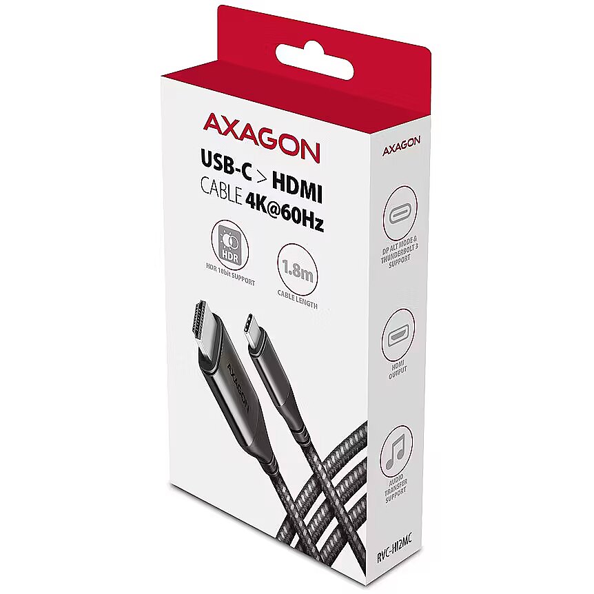 LongDesc - Modern USB-C > HDMI active cable - adapter AXAGON RVC-HI2MC for connecting a HDMI monitor/TV/projector to a notebook or phone using USB-C connector. A hardware converter ensures quality image up to 4K/60Hz Ultra HD resolution without any installation. Popular gaming resolution WQHD 2560 x 1440 at 60, 120 and 144 Hz or FullHD 1920 x 1080 at 60, 120, 144 and 240 Hz are also supported. Thanks to HDR (high dynamic range) support, you can enjoy a significantly expanded range of colors and contrasts without restrictions.Durable cable is equipped with solid metal ends, connectors with a nickel-plated surface and gold-plated contacts. The final strength of the cable is provided by the nylon braid. The bonus is a practical strip for easy packing of the cable. Video and audio transfer from a computer, laptop, phone or Apple MacBook will now be easy.Compact dimensions provide the possibility to use the cable in insufficient space. The converter dimensions are almost identical to the standard cable connectors. You have an ideal solution - you don't need a cable and converter, with this active cable everything is integrated into one compact unit.The cable is only oneway, i.e. USB-C to HDMI, not otherwise. A USB-C port with DisplayPort Alternate Mode (DP Alt Mode) support of a device with Thunderbolt 3/4 port is required for the adapter to function properly. Input:• USB-C• USB type C (M) male connectorOutput:• HDMI 2.1a 4K/60Hz HDR10 (before HDMI 2.0a)• HDMI (M) male connectorSupported resolutions:• max. 4096 x 2160 (19:10) @60Hz DCI 4K• 3840 x 2160 (16:9) @60Hz UHD-1 4K (UHDTV)• 3840 x 1600 (21:9) UW 4K (Ultrawide 1600p)• 3840 x 1200 (32:10) 29:9 4K (Super ultrawide 1200p)• 3840 x 1080 (32:9) 32:9 4K (Super ultrawide 1080p)• 3440 x 1440 (21:9) UWQHD (Ultrawide 1440p)• 2560 x 2048 (5:4) QSXGA• 2560 x 1920 (4:3)• 2560 x 1600 (16:10) WQXGA• 2560 x 1440 (16:9) @60, 120 a 144Hz QHD• 2560 x 1080 (21:9) UWFHD (Ultrawide 1080p)• 2048 x 1536 (4:3) QXGA• 2048 x 1152 (16:9) QWXGA• 1920 x 1440 (4:3) • 1920 x 1200 (16:10) WUXGA• 1920 x 1080 (16:9) @60, 100, 120, 144 a 240Hz Full HD/1080p• 1856 x 1392 (4:3)• 1792 x 1344 (4:3)• 1680 x 1050 (16:10) WSXGA+• 1600 x 1200 (4:3) UXGA• 1600 x 900 (16:9) HD+• 1536 x 864 (16:9)• 1440 x 900 (16:10) WXGA+• 1400 x 1050 (4:3) SXGA+• 1366 x 768 (16:9) HD• 1360 x 768 (16:9) HD• 1280 x 1024 (5:4) SXGA• 1280 x 960 (4:3) SXGA-• 1280 x 800 (16:10) WXGA• 1280 x 768 (5:3) WXGA• 1280 x 720 (16:9) HD/WXGA/720p• 1280 x 600• 1152 x 864 (4:3) XGA+• 1024 x 768 (4:3) XGA• 800 x 600 (4:3) SVGA* the adjustable resolution and frequencies depend on monitor/TV/projector and graphics adapter parameters.Other features:• Supported modes: mirroring the desktop (default setting),extension of the primary monitor area.• HPD (Hot-Plug-Detect) support - communication sequence controlling the connection/disconnection of the device while running,• Support up to 8-channel sound - 96 kHz at 24 bits,• HDR (High dynamic range, 10 bit support) support - realistic reproduction of light and dark details.• Compliant with USB Type-C Cable and Connector Specification Revision 1.1 specification,• Compliant with VESA DisplayPort Alt Mode on USB Type-C Standard Version 1.0 specification,• Compliant with USB Device Class Definition for Billboard Devices Revision 1.0 specification.• Compliant with HDMI Specification 2.1a 4K/60Hz HDR10 specification (before HDMI 2.0a).• TMDS (Transition Minimized Differential Signaling) support - transfer of auxiliary image, sound and additional data.• HDCP 2.2 (High-bandwidth Digital Content Protection) support - a mechanism used to protect the digital contents.• Support of power saving modes with spinning down controlled by a source device (PC) and a viewing device (monitor/TV).• Power supply via USB-C – no external power is needed.• Dimensions of converter body 48 x 21 x 10 mm,• Total cable length incl. connector 180 cm,• Weight 70 g,• Operating temperature 0 ~ 45°C.• Storage temperature: -10 ~ 70°C.Supported OS: • Microsoft Windows, macOS, Android and Chrome OS – updated.• Compatibility depends on the operating system and device manufacturer support.• Graphics card drivers may also affect RVC-HI2MC functionality. We recommend downloading the latest version of the drivers.Package contains:• USB-C > HDMI cable length 1.8m,• multilingual manual CZ / DE / DK / ENG / ESP / FIN / FR / GR / HR / HU / IT / NL / PL / PT / RO / RU / SK / SWE / BG / CN / TR / ARA,• packed in a cardboard box with a hanging hole.