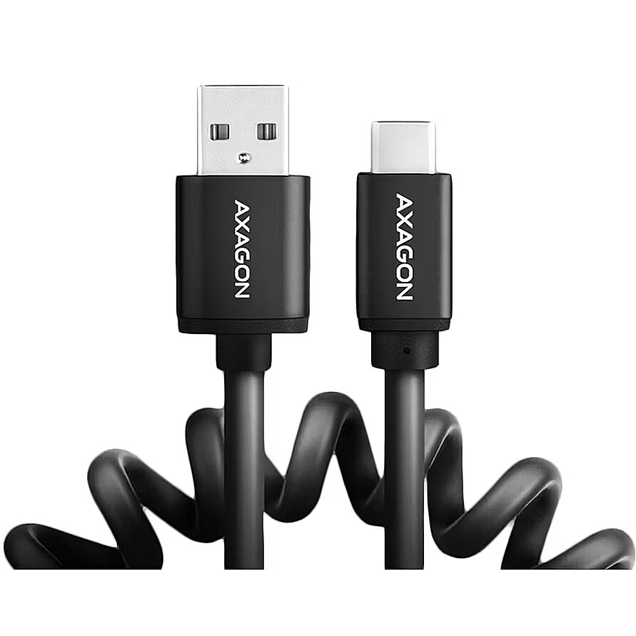 LongDesc - Twisted connection USB-C USB-A Data and Charging AXAGON BUCM-AM20TB TWISTER USB 2.0 cable with USB-C male and USB-A male connectors. The cable is designed for synchronizing data and charging laptops, phones, tablets and other mobile devices. The cable supports data transfer at speeds up to 480 Mb/s, is compatible with Quick Charge, Samsung AFC, Huawei FCP, SMART and other charging technologies. The connected device can be charged with a current of up to 3A.Durable data and power cable with extended service life is equipped with metal terminals, connectors with a nickel-plated surface and gold-plated contacts. Cable conductors are made of Tin-plated oxygen free copper. High-quality cable insulation, made of flexible TPE, guarantees maximum durability and also maintains sufficient flexibility. Thanks to the twisted and winding design, the cable takes up a minimum of space and is an ideal accessory for the car. In the shortened state, the cable is only 50 cm long and does not obstruct anywhere. When stretched, it comfortably reaches 110 cm away from the socket.Power cables 22AWG (lower number = larger cross-section and lower wire resistance) guarantee fast charging of phones and other mobile devices. Data wires 30AWG together with high-quality shielding, ensure reliable data transmission. Double shielding protects transmitted signals from adverse interference.Durable cable gland reduces dangerous cable bending. The mechanical resistance of the cable is also increased by the aluminum terminal covers. Connectors:• USB-C (M) male • USB-A (M) male Other Features:• DATA SYNC & FAST CHARGING - simultaneous data transfer and mobile device battery charging.• USB 2.0, compatible with USB 1.1.• Supports 480 / 12 / 1.5 Mb/s (High / Full / Low speed) transmission rates. • Support for high-speed charging by current up to 3A.• Supported charging technologies: Qualcomm Quick Charge 2.0/3.0, Samsung Adaptive Fast Charging, Huawei Fast Charge Protocol, SMART Charging and others.• Cable includes power wires 22AWG, data wires 30AWG. • Tin-plated oxygen free copper conductors to reduce oxidation, increase conductivity, and clear signal without distortion.• Shielding via galvanized foil and oxygen free copper braiding minimizes interference and prevents signal loss.• Nickel-plated connectors and gold-plated contacts prevent oxidation and provide a reliable connection.• Suitable for mobile phones and smartphones, tablets, powerbanks, cameras and other mobile devices with USB-C connector.Other data: • Cable length 110 cm in stretched state, 50 cm in shortened state,• outer diameter of the cable 4.2 mm.Package contains:• USB-C M USB-A M twisted black cable, • packed in a printed and sealed foil package with hanging hole.
