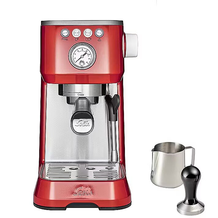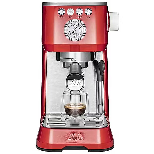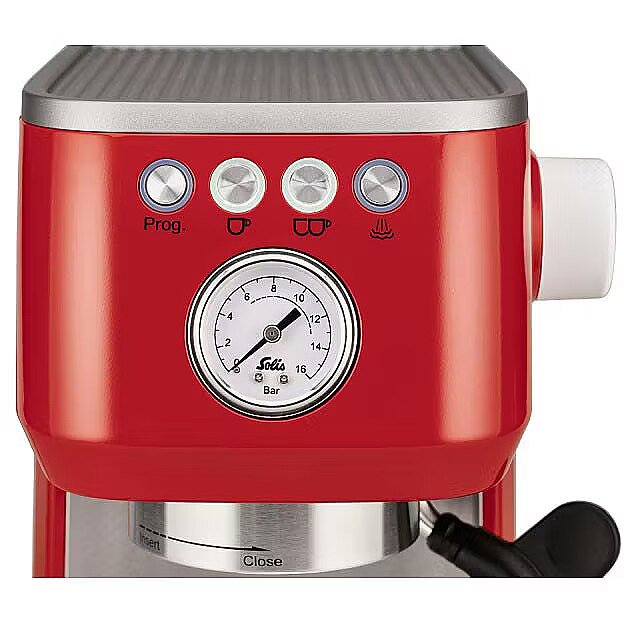 A product developed with a passion for coffee, designed to bring out the best in every coffee bean. The perfect tool for crafting coffee like a true barista. Integrated pressure gauge The gauge makes it easy to monitor extraction pressure for a well-balanced cup of coffee. 360° steam/hot water wand Use the hot water function to prepare an Americano, Long Black, or other hot drinks. Coffee in 40 seconds The Solis Barista Perfetta Plus Red is ready to use in just 40 seconds and delivers a perfect, stable brewing temperature. Low-pressure pre-infusion Freshly ground coffee is gently moistened under low pressure to prepare it for even extraction. Energy-saving mode Choose between 3 automatic shut-off options and energy-saving mode to conserve resources. Stability and control with adaptive PID The adaptive PID ensures multi-stage temperature control to fully develop the aromas of your coffee. This semi-automatic coffee machine operates quietly and lets you enjoy a delicious cup of coffee or tea just the way you like it. It heats up in just 40 seconds, so your first cup is ready in a minute.