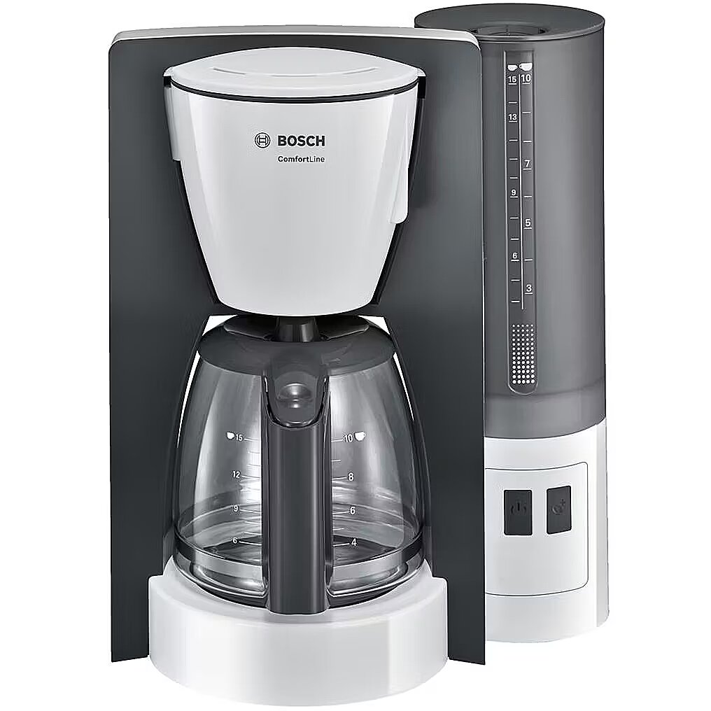 LongSummaryDescription - Bosch TKA6A041. Product type: Drip coffee maker, Coffee input type: Ground coffee, Reservoir for brewed coffee: Jug. Power: 1200 W. Product colour: Grey, White
