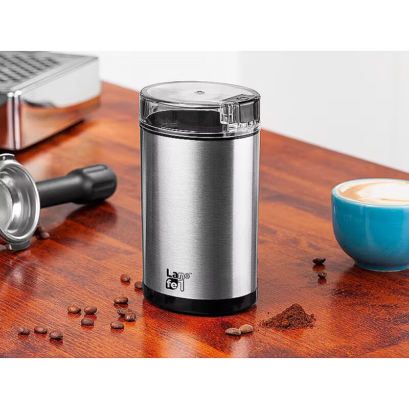 Description - Coffee grinder MKB-006 steel The LAFE MKB-006 coffee grinder is the ideal choice for coffee lovers who appreciate the highest quality and aroma of freshly ground coffee. Simple operation Thanks to the easy-to-use user interface, you can easily grind your favourite coffee. Simply insert the coffee beans into the grinding chamber, close the lid and press the button. Robust metal construction The knives and grinding chamber are made of stainless steel for long life and easy cleaning. Spacious grinding chamber The grinding chamber holds approximately 70 g of coffee, which is enough to make several cups of aromatic coffee. Safe design An additional advantage of the machine is the protection against switching on without the lid, which ensures safe use. If you are looking for a reliable and sturdy coffee grinder to enjoy delicious coffee at home, then this product will meet your expectations.