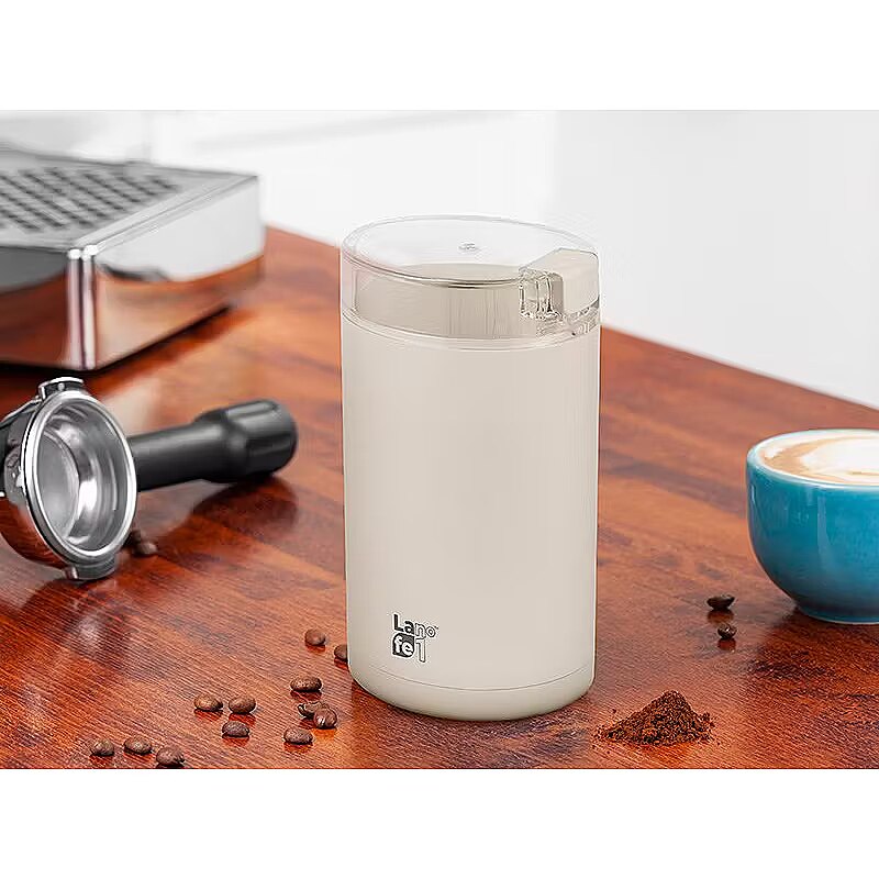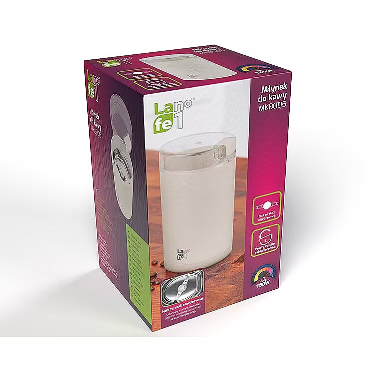 Description - MKB-005 coffee grinder The LAFE MKB-005 coffee grinder is the perfect choice for coffee lovers who value the highest quality and aroma of freshly ground coffee. Here is some additional information you may be interested in: Simple operation Thanks to the easy-to-use user interface, you can easily grind your favorite coffee. Just place the coffee beans into the grinding chamber, close the lid and press the button. Solid metal construction The knives and grinding chamber are made of stainless steel, which ensures long service life and easy cleaning. Capacious grinding chamber The grinding chamber can hold approximately 70 g of coffee, which is enough to prepare several cups of aromatic coffee. Safe construction An additional advantage of the device is protection against switching on without the cover, which ensures safe use. If you are looking for a reliable and solid coffee grinder that will allow you to enjoy delicious coffee at home, this product will meet your expectations.