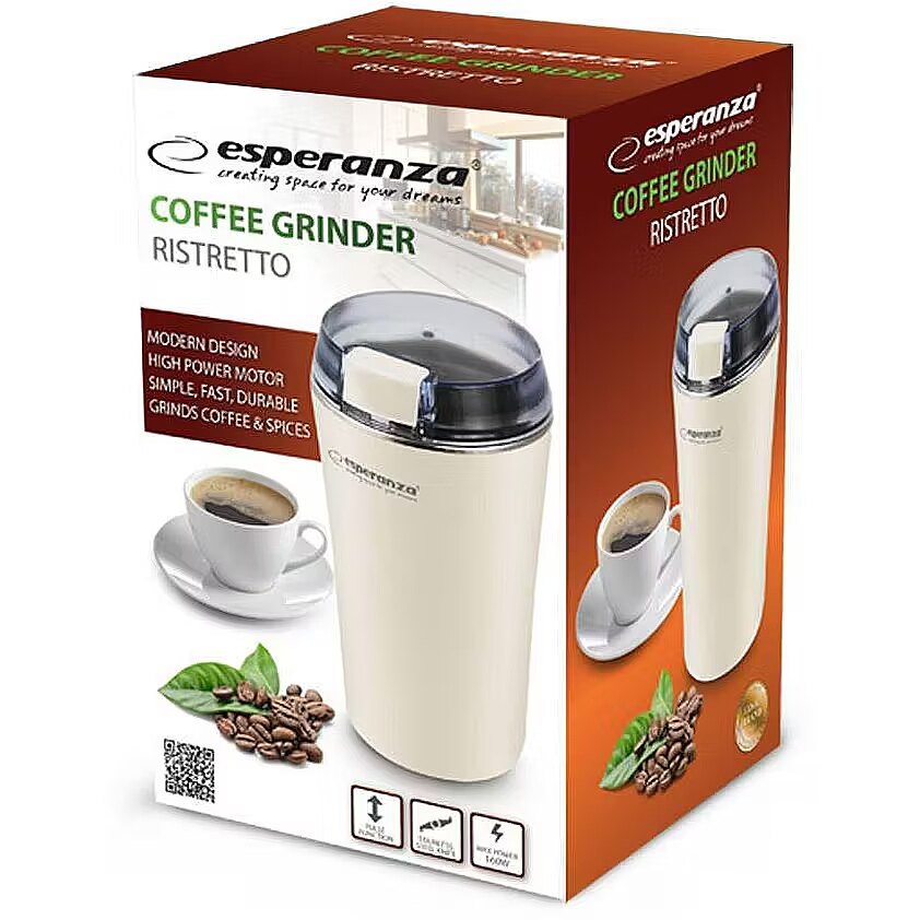 Description - Start your day with aromatic, fresh coffee ground just before brewing. With our Esperanza RISTRETTO coffee grinder, you can do it quickly and easily, and you can adjust the thickness of the ground beans to your own preferences. Created especially for coffee lovers, for whom coffee is not just a drink but a way to get in a great mood from the morning. The grinder will also work as an excellent helper in the kitchen when grinding spices or nuts. Its modern and ergonomic shape and small size will fit into any kitchen. Enjoy the taste of freshly ground coffee FOR COFFEE AND MORE MODERN DESIGN STAINLESS STEEL KNIFE Power: 160 W Power supply: 220-240 V Frequency: 50 Hz Capacity: 70 g Length of electric cord: approx. 95 cm Grinder height: 17.0 cm Grinder diameter: 8.7 cm Colour: white