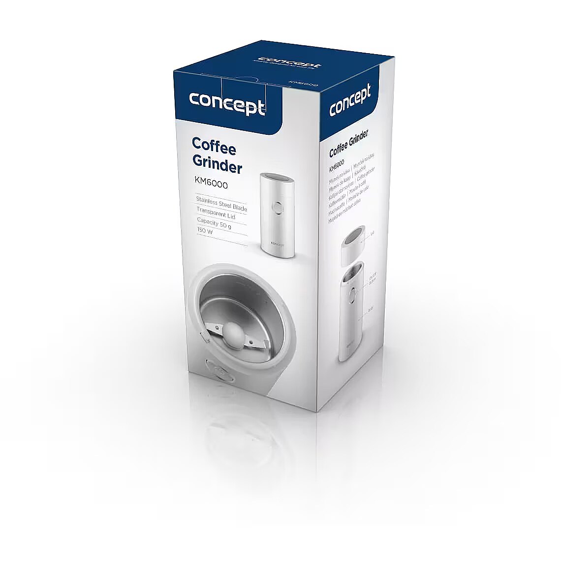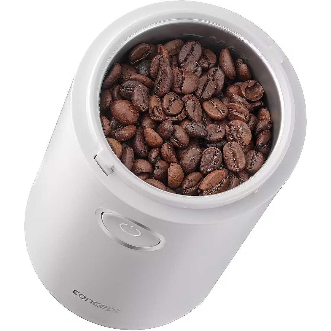 Description - Młynek na każdą okazję Młynek do kawy Concept KM6000 to doskonały wybór dla miłośników świeżo mielonej kawy oraz pasjonatów domowej kuchni. Jego główną funkcją jest mielenie ziaren kawy na idealną grubość, co zapewnia pełniejszy i bardziej intensywny smak napoju. Oprócz kawy, młynek doskonale sprawdzi się również do mielenia przypraw, ziół, orzechów oraz maku, co pozwala wzbogacić kulinaria o świeże i aromatyczne składniki. Prędkość i ostrza dla doskonałego mielenia Młynek do kawy Concept KM6000 wyposażony jest w ostre stalowe dwuskrzydłowe noże, które zapewniają skuteczne i szybkie mielenie. Dzięki imponującej prędkości do 22 000 obrotów na minutę, z łatwością przekształca ziarna kawy, przyprawy i zioła w drobny proszek w zaledwie kilka sekund. Ta wysoka prędkość nie tylko przyspiesza przygotowanie, ale także pomaga zachować smak i aromat, co jest kluczowe dla wyjątkowego doświadczenia kulinarnego. Dzięki temu młynkowi łatwo osiągniesz idealną konsystencję wszystkich swoich ulubionych przepisów. Elegancki design i komfortowa obsługa Młynek do kawy Concept KM6000 w eleganckim białym kolorze łączy nowoczesny design z intuicyjną obsługą. Jego minimalistyczny wygląd doskonale wpasowuje się w każdą kuchnię, nadając jej stylowego charakteru. Sterowanie jednym przyciskiem jest bardzo proste i intuicyjne, dzięki czemu przygotowanie świeżej kawy jest szybkie i łatwe. Przezroczysta pokrywka umożliwia śledzenie procesu mielenia, dzięki czemu łatwo kontrolujesz pożądaną grubość. W przeciwieństwie do wielu konkurencyjnych młynków, Concept KM6000 został zaprojektowany z gładkim wnętrzem, które nie posiada trudnodostępnych zakamarków. W wielu innych modelach resztki zmielonych składników mogą osadzać się w szczelinach i rogach, co utrudnia czyszczenie oraz może prowadzić do przenikania smaków i aromatów pomiędzy kolejnymi użyciami. Dzięki przemyślanej konstrukcji Concept KM6000 gwarantuje łatwe utrzymanie higieny oraz zawsze świeży smak i aromat mielonych produktów.