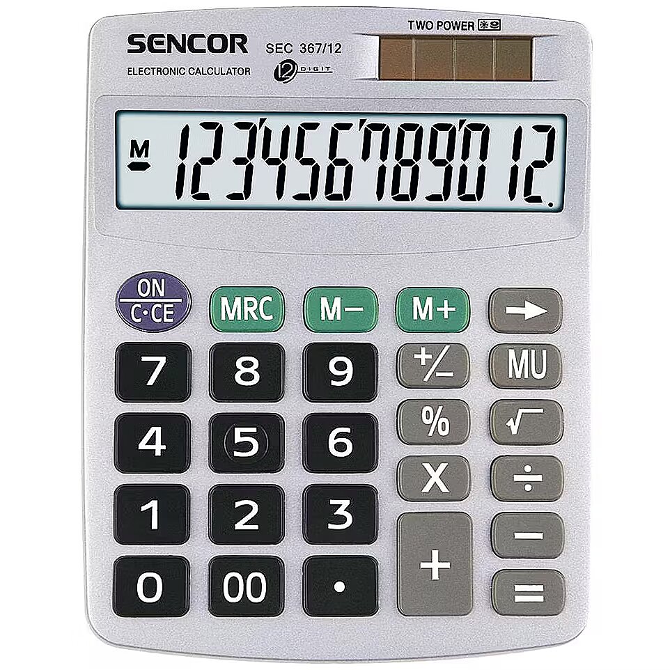 Accessories included - Color - Gray Description - Designation - CE+WEEE dimension depth - 110 mm dimension height - 170 mm Dimensions - 152 x 120 x 39 mm dimension weight - 230 g dimension width - 20 mm Display (digits) - 12-digits Display (lines) - 1-line ean - 8590669044832 guarantee - 24 guarantee_type - external name - Calculator SEC 367/12 Table,12 Digital LCD Other features - Power - Solar cell producer - Sencor Special functions - Typ - Office vendpn - SEC 367/12