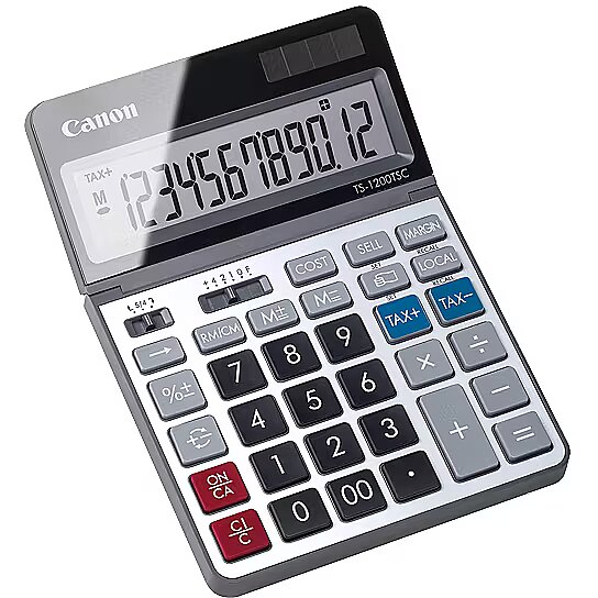 LongDesc - TS-1200TSC OverviewIntroducing the new Canon TS-1200TSC desktop calculator. The TS-1200TSC features a 12-digit adjustable LCD display and a variety of commands, such as tax functions, currency conversion, and business calculations. Boasting a metal faceplate and a large LCD display, the TS-1200TSC is the ideal calculator for any school or home office setting.