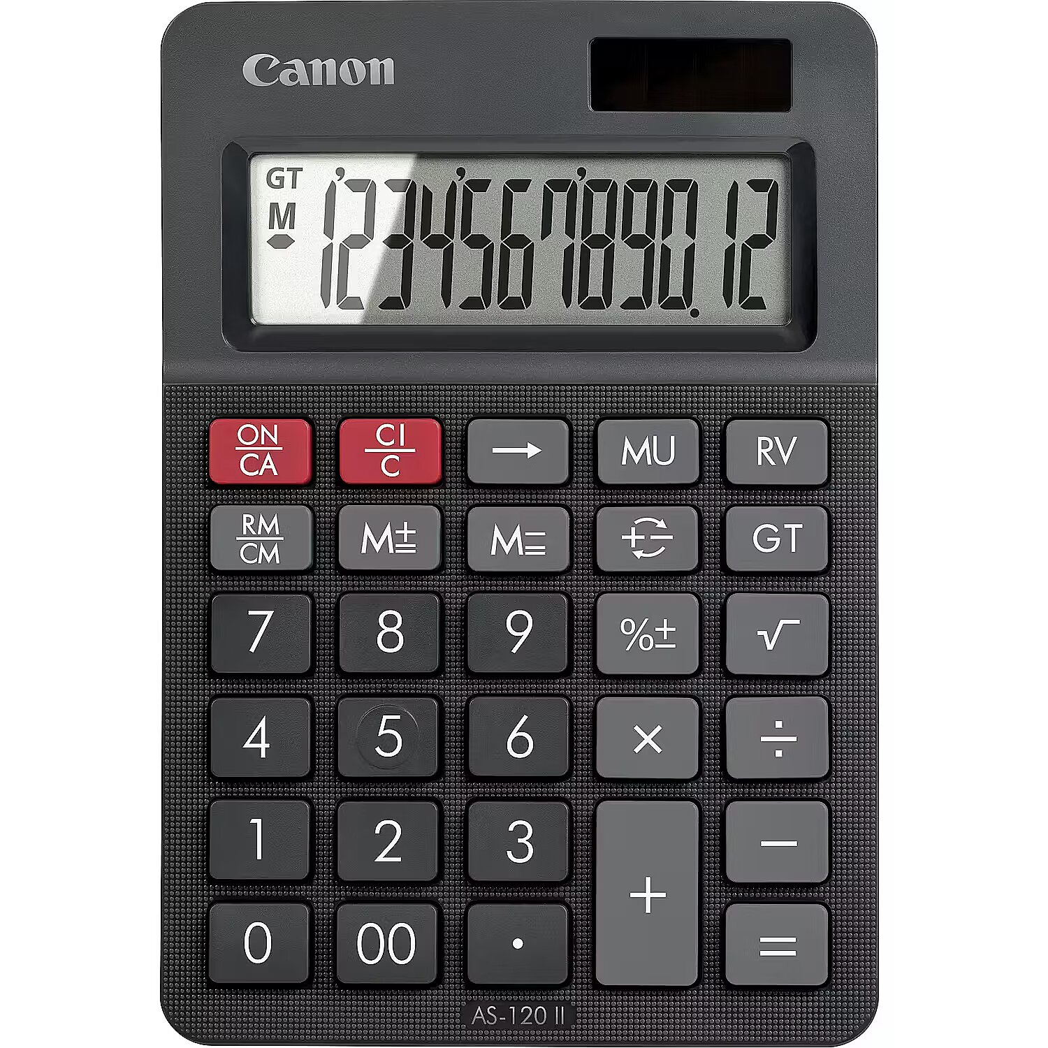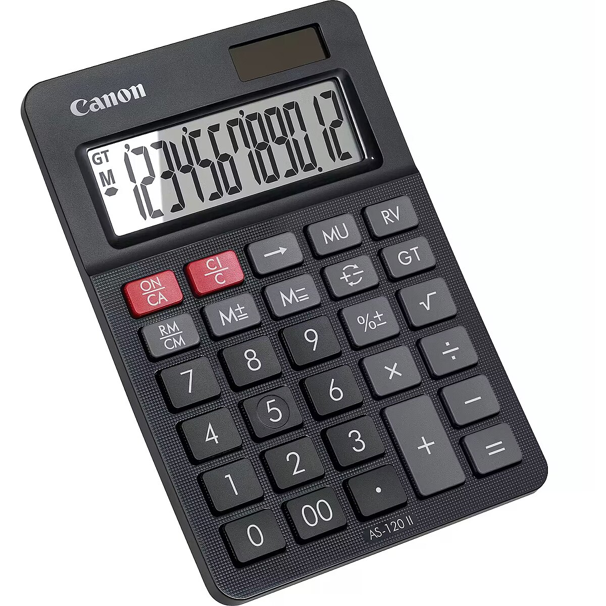 LongDesc - The AS-120 II is a desktop calculator with a 12-digit upright angled display. It also supports mark-up and reverse functions. The impressive grand total memory function means your complex calculations are made easy by saving up the subtotals after each calculation and computing the accumulated totals with a single touch. Some parts of the AS-120 II calculator have been manufactured from recycled Canon product material.