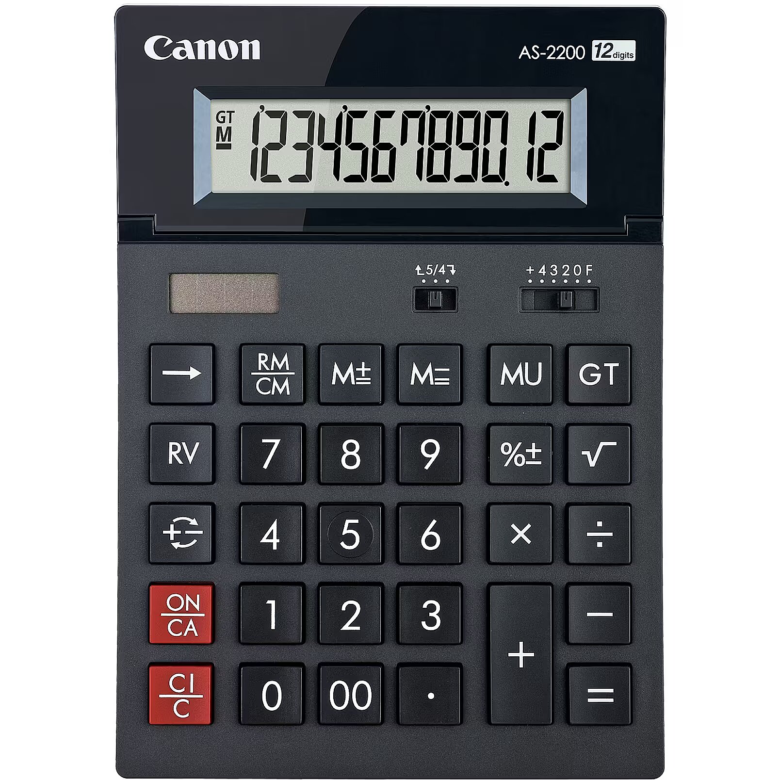 The AS-2200 calculator offers an extensive range of functions. A slide switch provides easy decimal point selection and rounding. The Grand Total memory automatically accumulates totals. Other convenient keys include Mark-up, Reverse and all the regular functions youd expect from a Canon calculator.