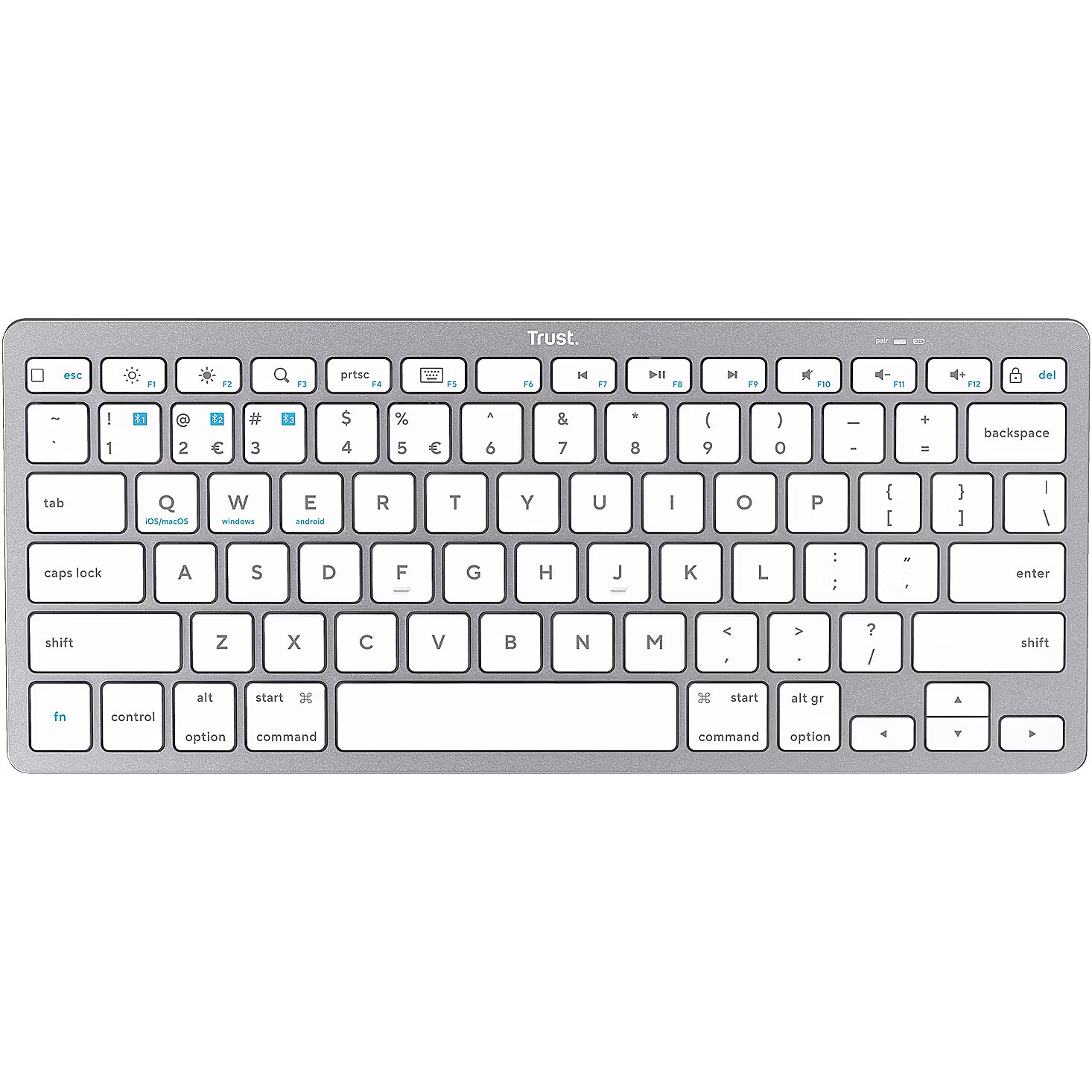 LongSummaryDescription - Trust 24651. Keyboard form factor: 75%. Keyboard style: Straight. Connectivity technology: Wireless, Device interface: Bluetooth, Keyboard key switch: Scissor key switch, Keyboard layout: QWERTY, Keyboard number of keys: 85, Recommended usage: Universal. Product colour: Silver