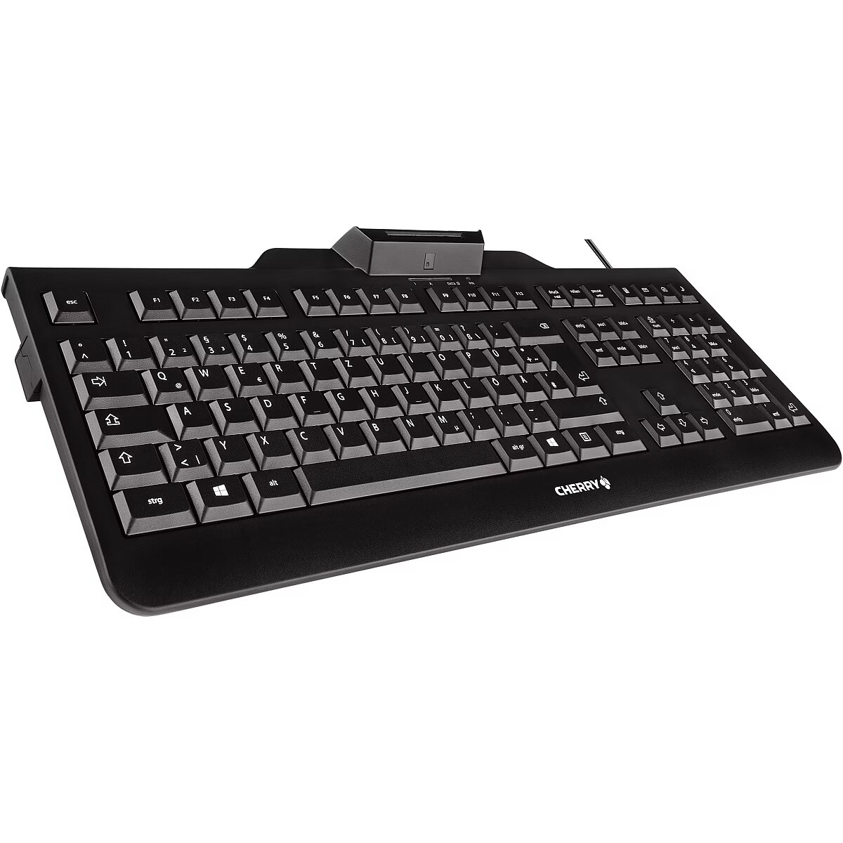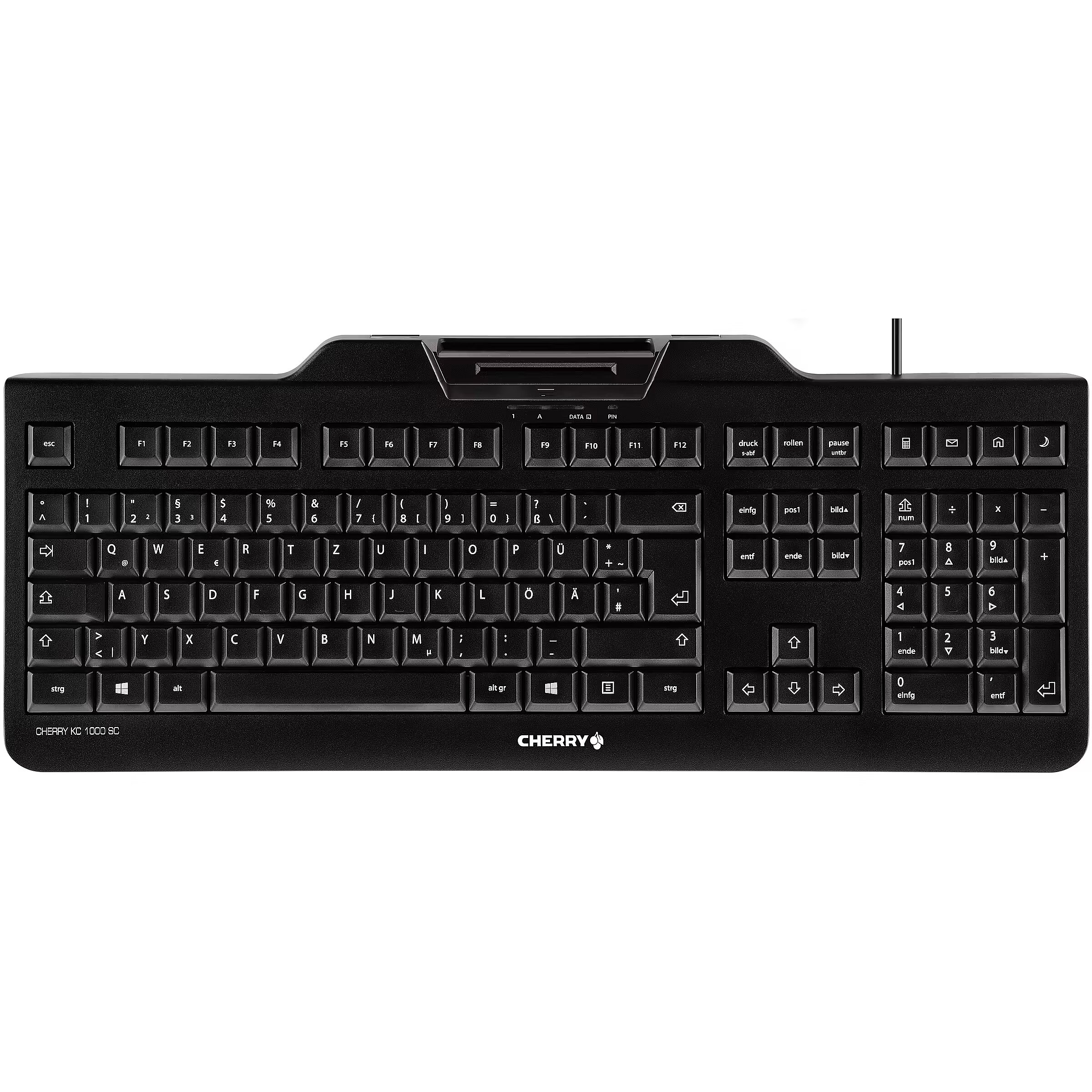 LongSummaryDescription - CHERRY KC 1000 SC Corded Smartcard Keyboard, Black, USB (QWERTY - UK). Keyboard form factor: Full-size (100%). Keyboard style: Straight. Connectivity technology: Wired, Device interface: USB, Keyboard key switch: Mechanical, Keyboard layout: QWERTY, Keyboard number of keys: 105. Cable length: 1.8 m. Recommended usage: Universal. Product colour: Black