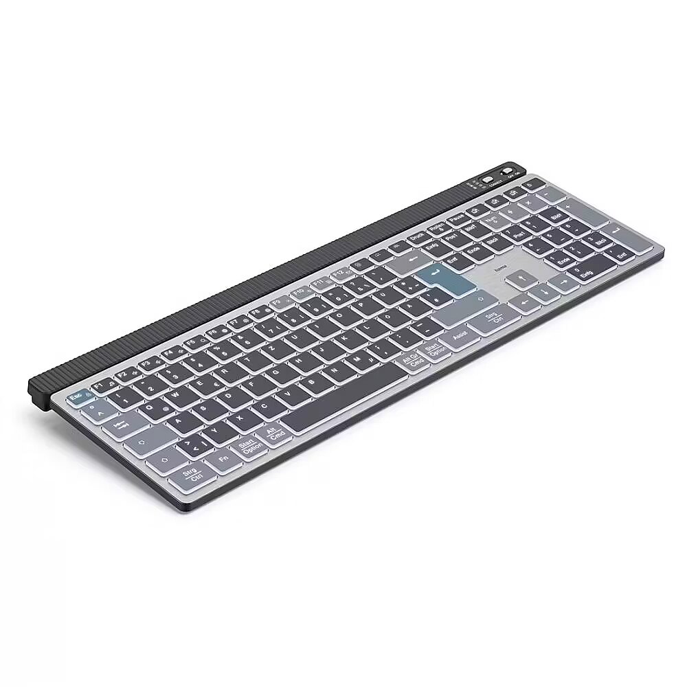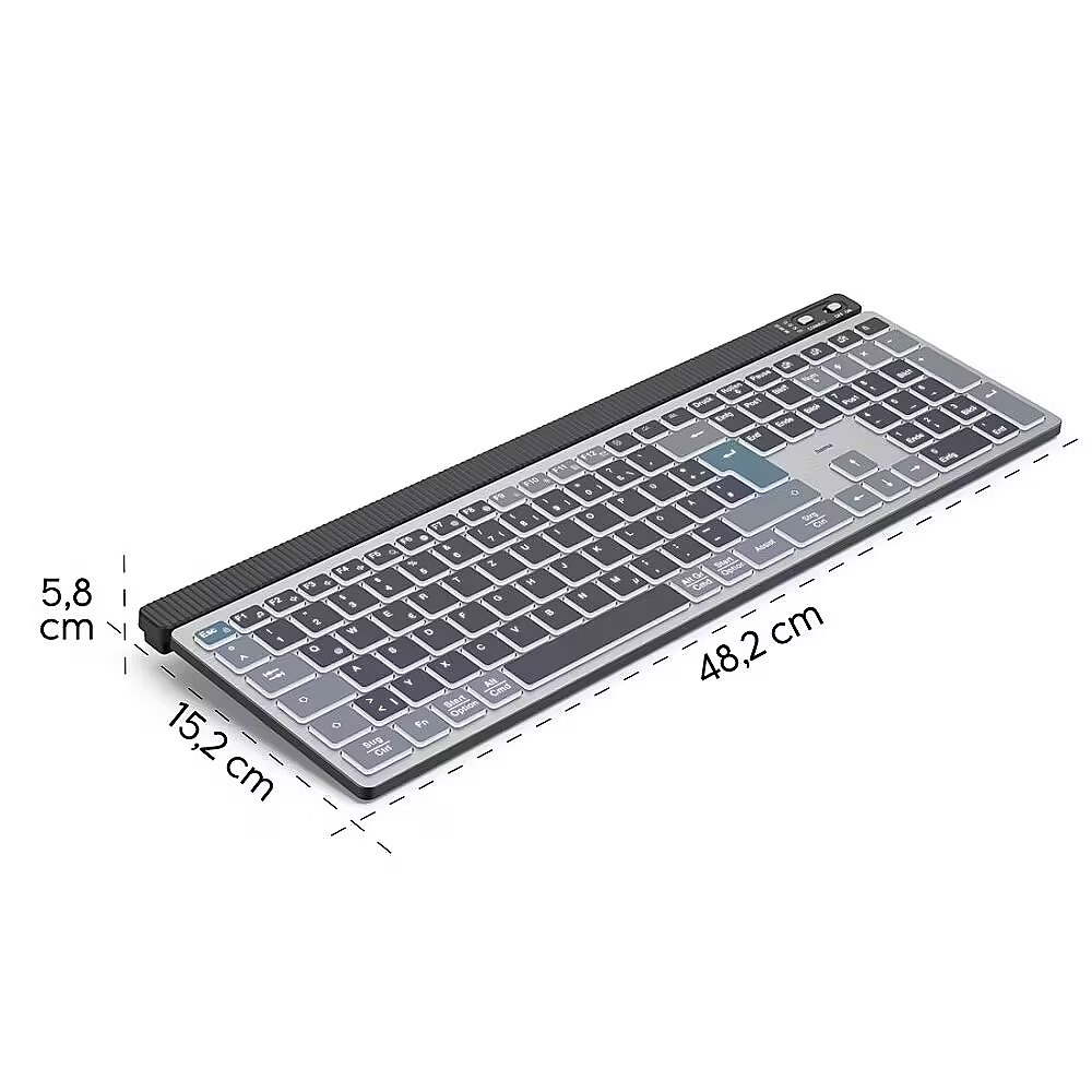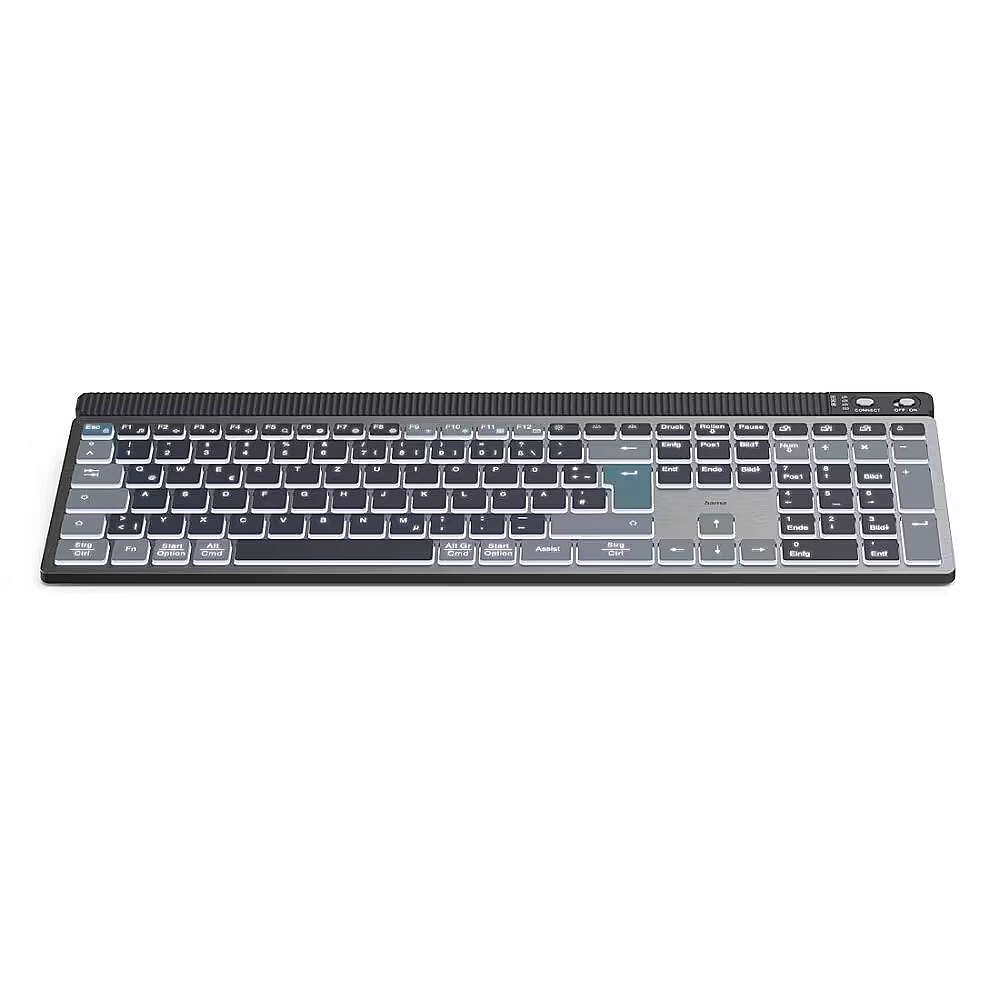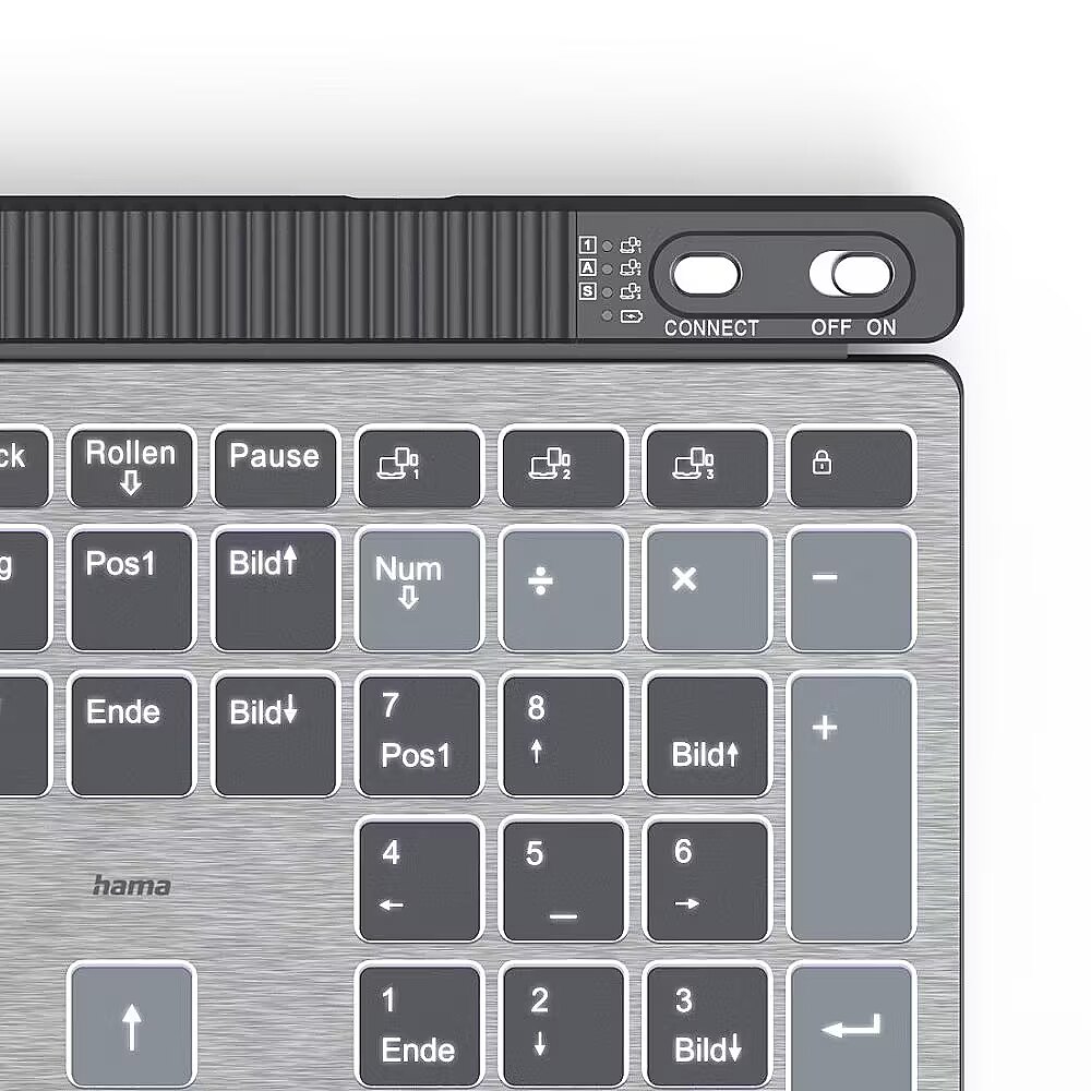 Klawiatura bezprzewodowa Hama WK-750 oferuje wszechstronną łączność multi-device, umożliwiając jednoczesne podłączenie do trzech urządzeń (1 USB, 2 Bluetooth) i szybkie przełączanie między nimi za pomocą przycisku. Stabilne połączenie 2,4 GHz oraz Bluetooth 5.2 zapewnia swobodę użytkowania na odległość do 10 metrów.