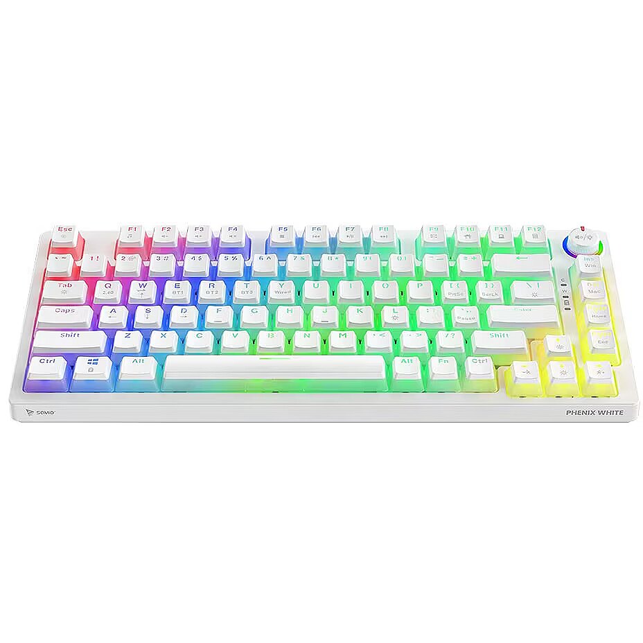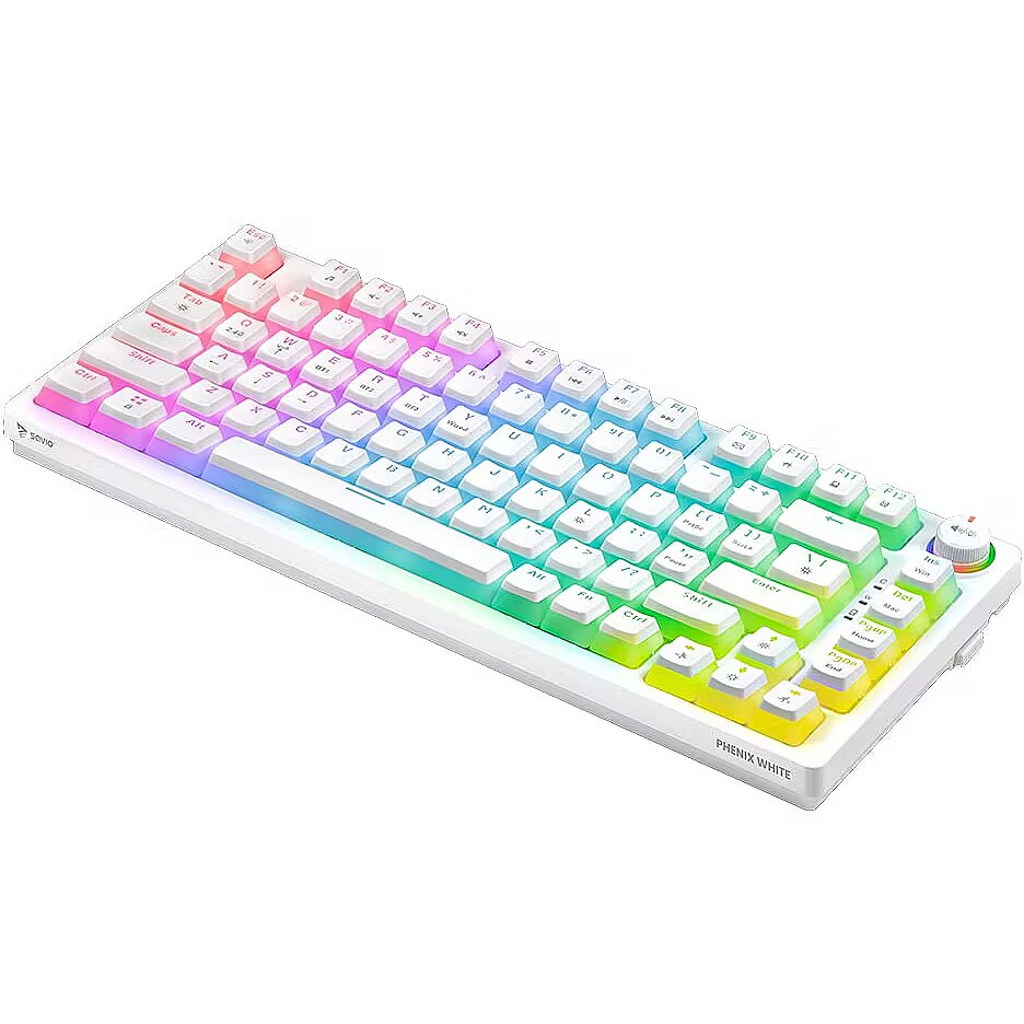 Description - Wireless mechanical keyboard Phenix White YELLOW PUDDING The Phenix White mechanical keyboard combines high-quality craftsmanship with user-friendly convenience, making it an excellent choice for gamers. It offers a rich set of features and broad compatibility with various operating systems and devices. Its compact 82-key layout makes it perfect for intense gaming sessions.     3 Connection Modes Phenix White provides three connectivity options: 2.4 GHz wireless, Bluetooth, and wired via USB. Users who value a cable-free setup and freedom of movement can use the wireless or Bluetooth connection. Those who prioritize stability and zero latency can connect the keyboard directly with a USB cable. Full N-Key Rollover and Anti-Ghosting Equipped with full N-Key rollover and anti-ghosting functionality, the Phenix White keyboard registers every key press, even when multiple keys are pressed simultaneously. This ensures that no action is missed during fast-paced gameplay. Gateron Pro Switches The keycaps are made using pudding technology, combining transparent sides with a matte surface to provide striking backlighting and durability. Gateron Pro switches offer reliability and comfort, with a lifespan of up to 100 million clicks.   Dedicated Software The dedicated software allows users to customize functions, lighting effects, and key settings, making it easy to tailor the keyboard to individual preferences and enhance the gaming experience. Multifunctional Knob The Phenix White keyboard features a multifunctional knob that allows users to adjust lighting brightness, control volume, change tracks, mute audio, and switch lighting modes using the integrated button. Phenix White is the perfect tool for gamers seeking reliable equipment for demanding tasks.