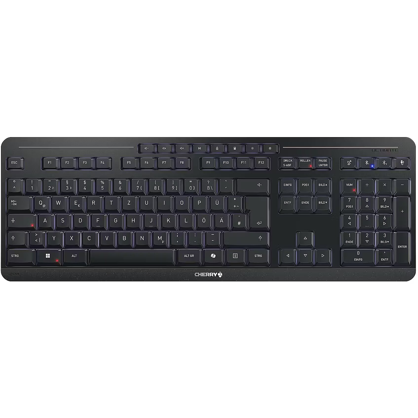LongSummaryDescription - CHERRY Stream keyboard ultimate. Keyboard form factor: Full-size (100%). Keyboard style: Straight. Connectivity technology: Wired & Wireless, Device interface: USB + RF Wireless + Bluetooth, Keyboard key switch: Scissor key switch, Keyboard layout: QWERTZ. Backlight type: LED. Recommended usage: Home/Office. Product colour: Black