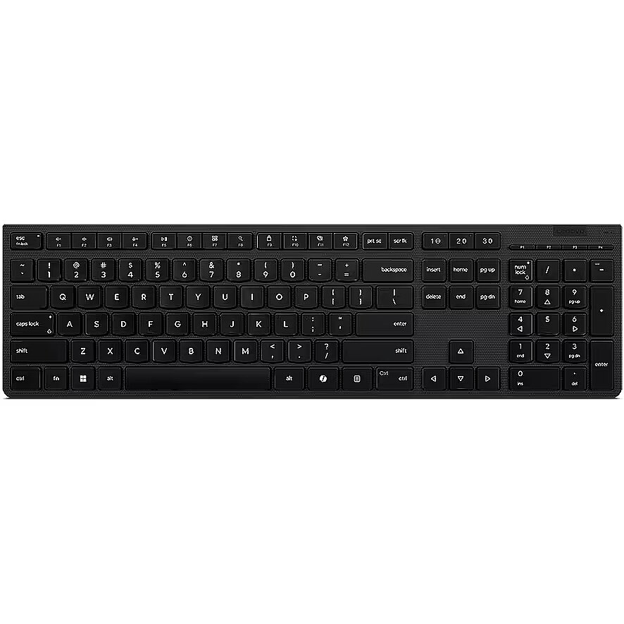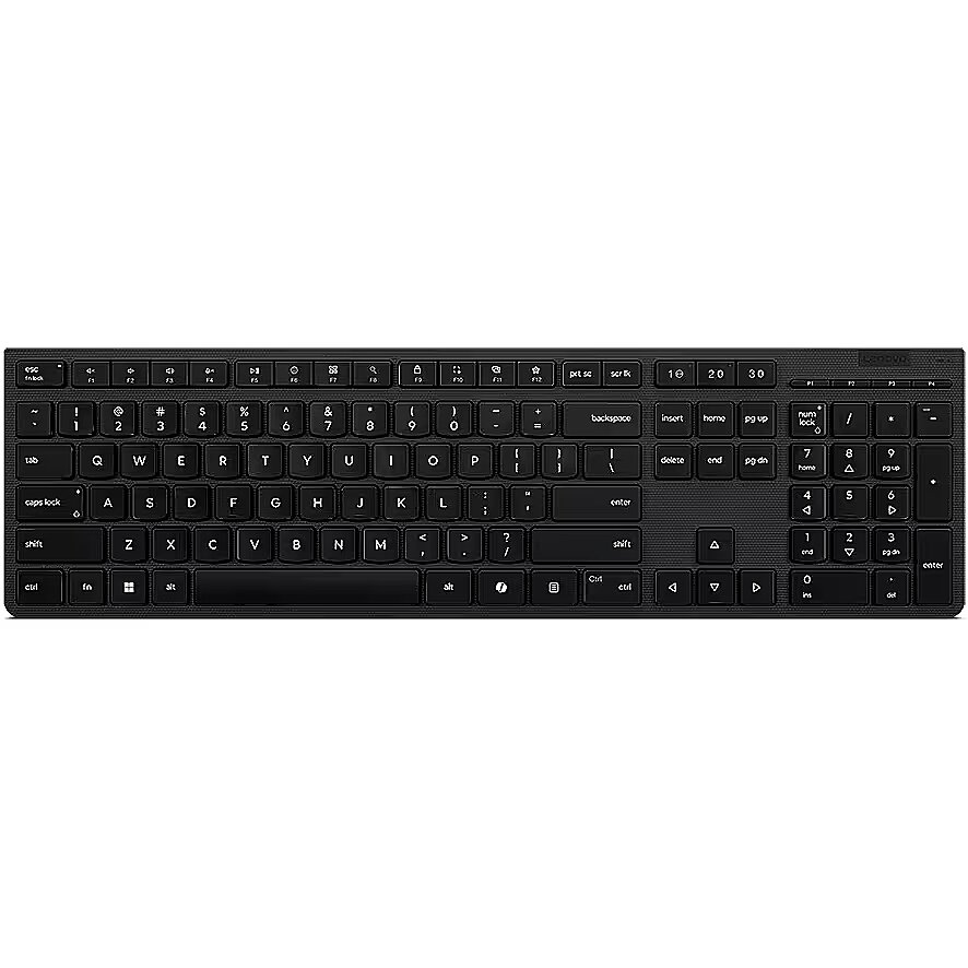Description - Lenovo Professional Wireless Rechargeable Keyboard-US Euro The Lenovo Professional Wireless Rechargeable Keyboard, its full-size keyboard sports scissor switches that create an elevated typing experience and improves your working efficiency with specialized Microsoft Copilot Key. Plus, its covers are made from eco-friendly 65% recycled material that protects the environment. Make charging easy with the integrated rechargeable battery in the keyboard, Seamlessly switch up to 3 devices via the 2.4G Unified dongle or Dual BT on multi-OS, Look your best with the sleek, contemporary design and premium textured finish, Do it all with a full 3-zone tilt-leg keyboard with worldwide language layouts, Experience the difference with responsive scissor-switch keys and silent typing, Be eco-friendly with our 65% PCC, Make it personal with programmable functions, Enjoy total peace of mind thanks to the 3-year warranty, Keyboard has AES 128 encryption and certified with Intel EVO. The Keyboard with Copilot Key, the Copilot in Windows is an AI-powered intelligent assistant. When Copilot is not available or enabled on the device, pressing the Copilot key will launch Windows Search.