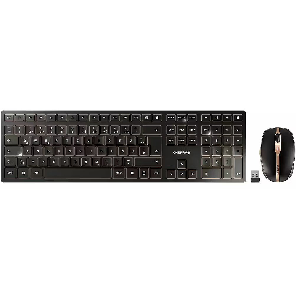 ShortSummaryDescription - CHERRY DW 9100 SLIM, Wireless, RF Wireless + Bluetooth, Scissor key switch, QWERTY, Black, Bronze, Mouse included