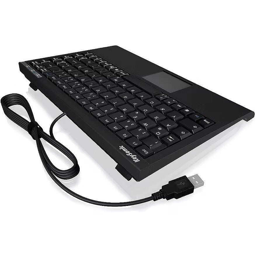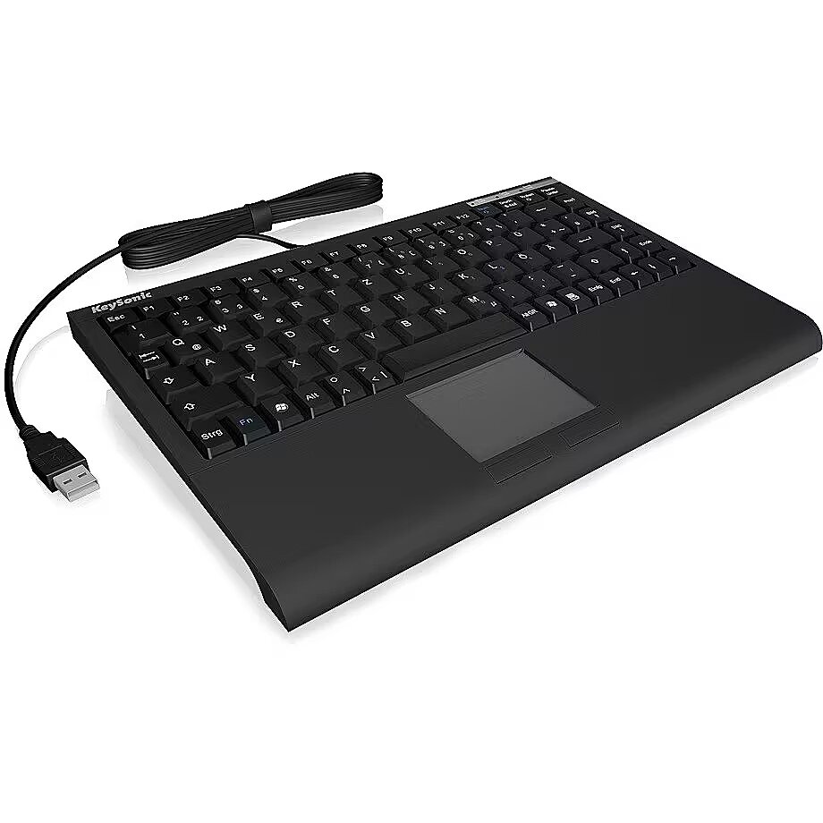 LongSummaryDescription - KeySonic ACK-540U+ (US). Keyboard form factor: Mini. Keyboard style: Straight. Connectivity technology: Wired, Device interface: USB, Keyboard key switch: Membrane, Keyboard layout: QWERTY. Wrist rest. Cable length: 1.9 m. Recommended usage: Office. Product colour: Black