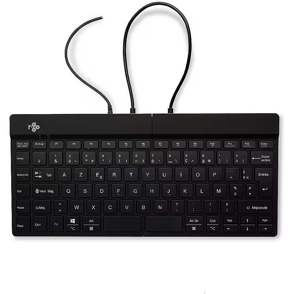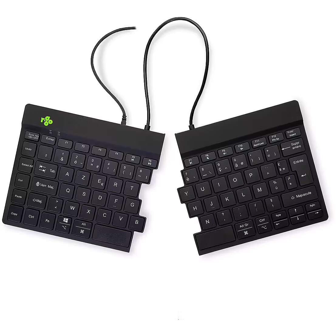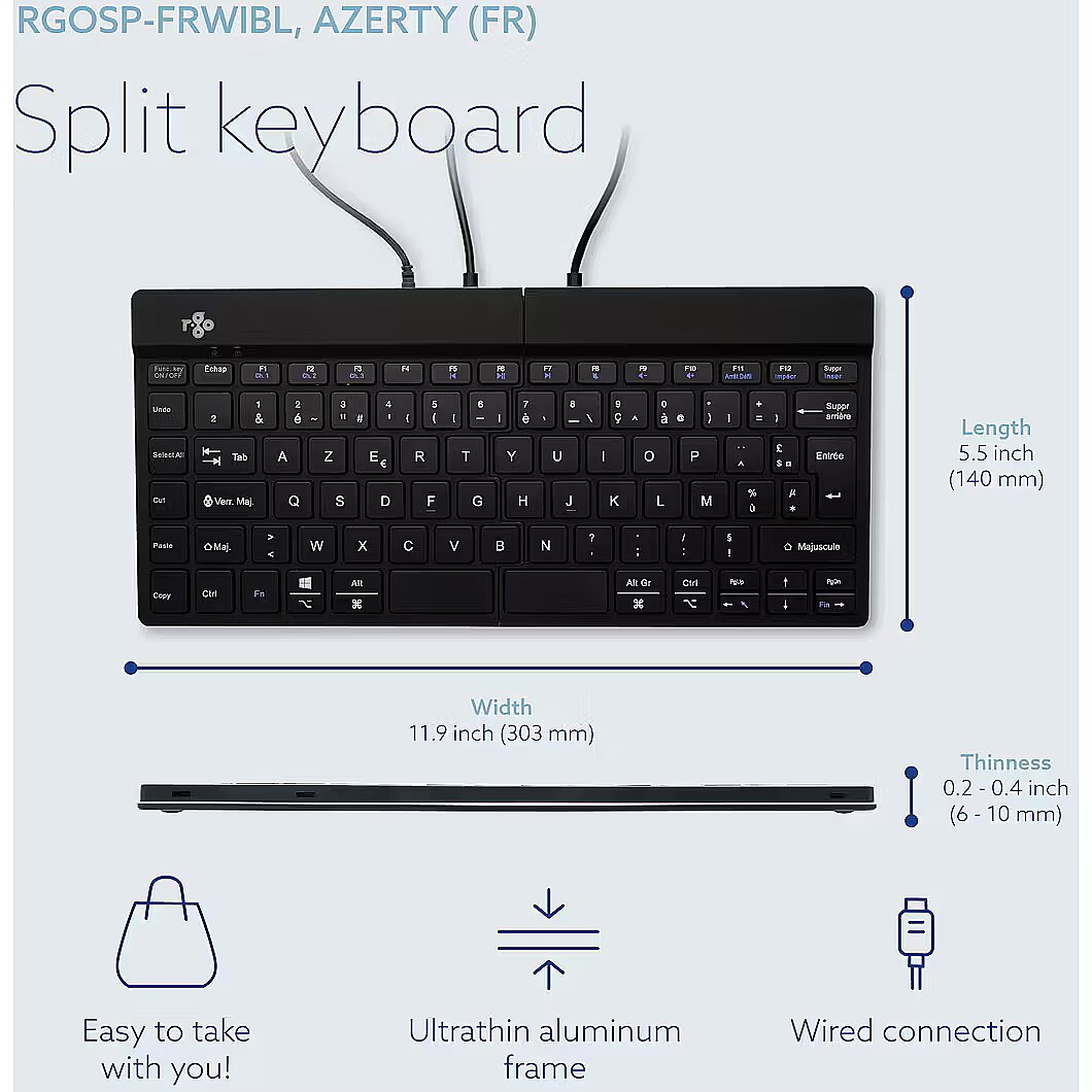 ShortSummaryDescription - R-Go Tools Ergonomic keyboard R-Go Split Break v2 with break software, ergonomic split keyboard, AZERTY (FR), Wired, black, Mini, Wired, USB, Scissor key switch, AZERTY, Black