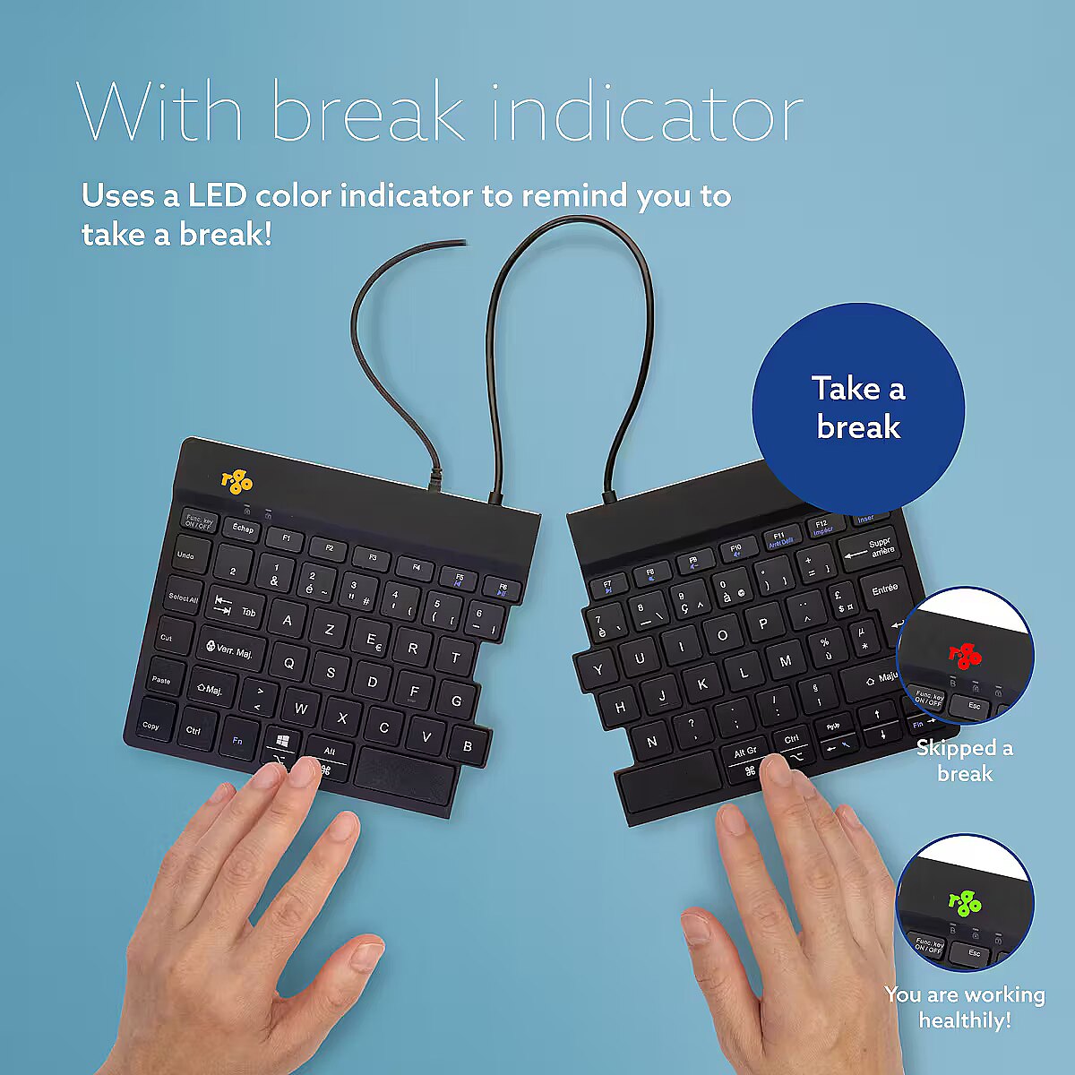 LongDesc - The R-Go Split Break keyboard is an ergonomically split keyboard with integrated break software. This keyboard encourages you to take regular breaks. This keeps your blood circulation flowing, prevents strain and keeps you fit during your working day.The keyboard consists of two separate parts that can be placed in any desired configuration. This split design prevents your wrists from bending while typing. Typing with straight wrists reduces muscle tension and prevents pinching of tendons and blood vessels. The built-in magnet allows you to convert the two separate parts of the keyboard into a compact keyboard with a single movement. The compact size ensures that the mouse is always within reach. The light keystrokes minimise muscle tension while typing. The keyboard is flat, keeping your hands and wrists flat and relaxed while typing.The LED colour signals in the keyboard indicate how healthy you are working and when it is time for a break. While typing, the light changes colour, like a traffic light. Green means “good going”, orange means it's time for a break, and red means you've been working too long. These subtle colour signals provide you with simple and positive feedback on your break behaviour. This product works in conjunction with the R-Go Break Software, which won the Benelux Office Product Award 2021.