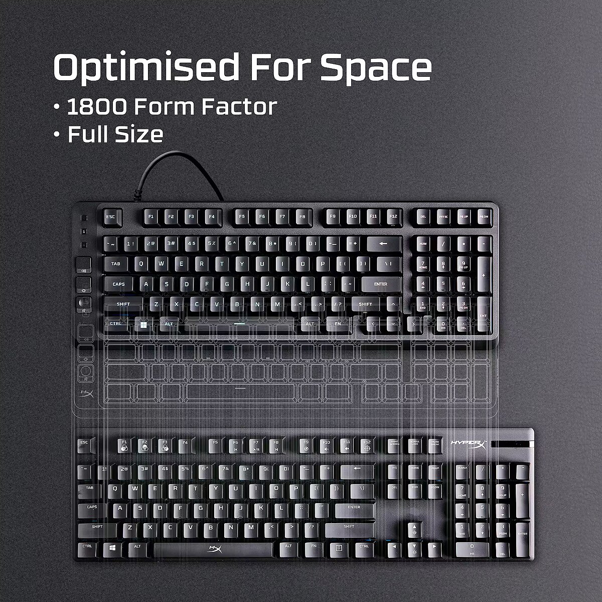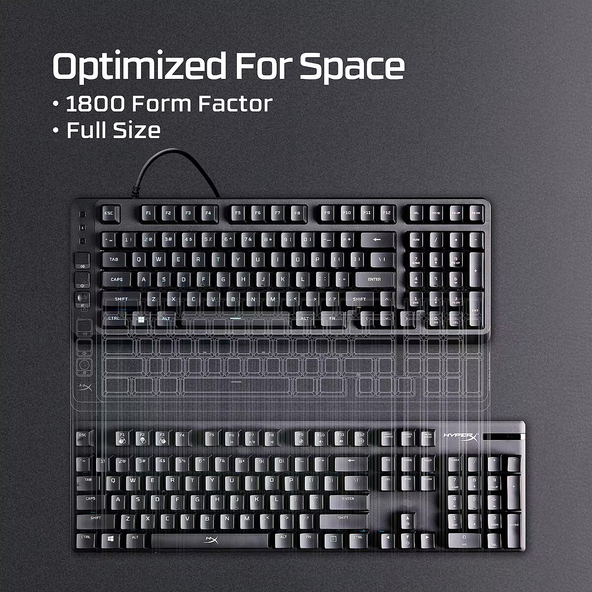HyperX Eve 1800 delivers a full-size keyboard in a condensed layout, giving you extra room for your headset, mouse, and other accessories.