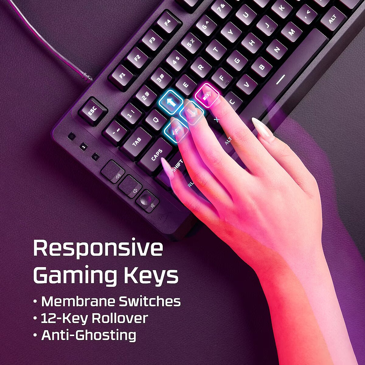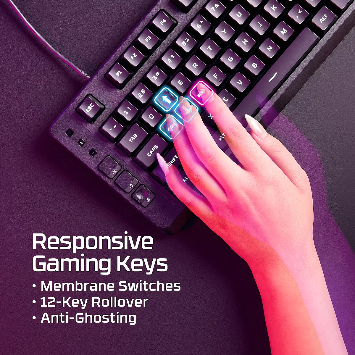 Eve 1800's membrane switches make every key feel cushioned and deliver satisfying tactile feedback, along with anti-ghosting and 12-key rollover that guarantee reliable keypress performance during gameplay.