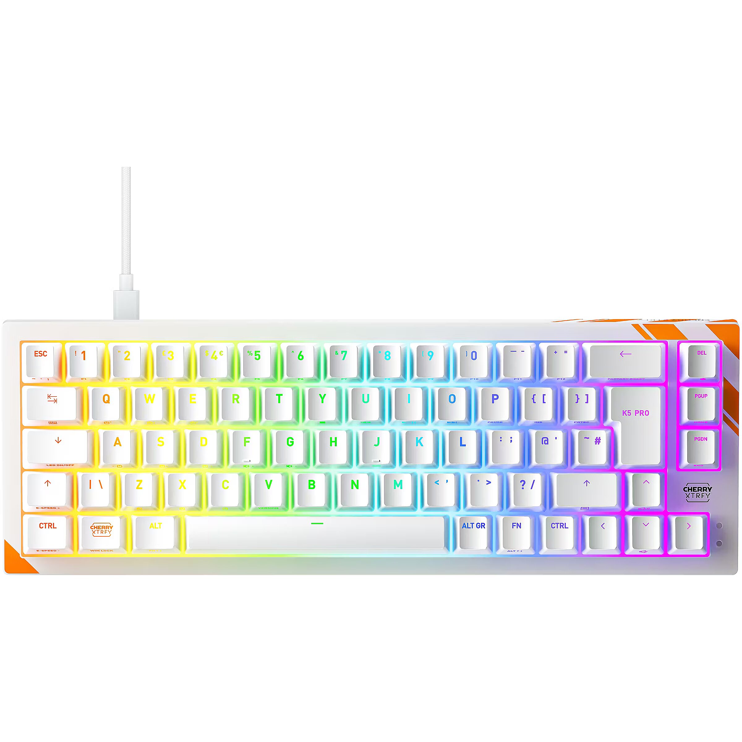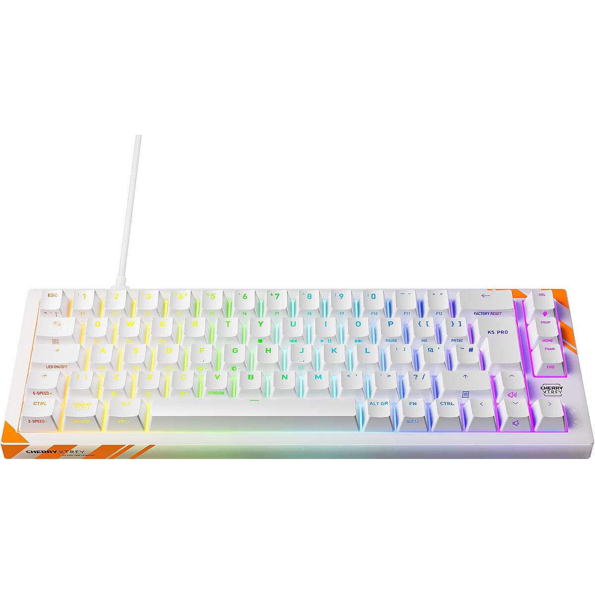 LongSummaryDescription - CHERRY K5 PRO TMR COMPACT. Keyboard form factor: 65%. Keyboard style: Straight. Connectivity technology: Wired, Device interface: USB, Keyboard key switch: Mechanical, Keyboard layout: QWERTY. Backlight type: RGB LED. Cable length: 2 m. Recommended usage: Gaming. Product colour: Orange, White