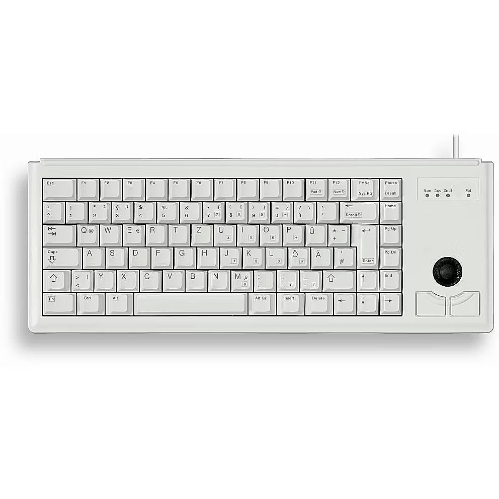 Technical_details - You need a pointing device? But you don't have enough room for a separate mouse? In that case the ultraflat compact keyboard with integrated trackball will solve your problem. It's perfect for 19 inch applications, Slimline PCs and notebooks. It also has additional input options for pen-based computers. - Two functions combined in one device. - Integrated, high-quality 16 mm trackball. - Retains cursor keys. - Space-efficient lightweight. - Extremely flat design. - Keycaps arranged in 18 mm grid. - LEDs indicate status of operating functions. - Number of keys: 84 (European version), 83 (US version). - Uses mechanical keys from our ML series with high-precision key action - High reliability thanks to Gold Crosspoint contacts. - Reliability: MTBF: 134,000 hours Individual keys have long service life: approx. 20 million key operations. Compatible to PC Connection Cabel Cable Length 1.75 m Keyboard Keys Main 83 Netto weight (without packaging) 563 grams