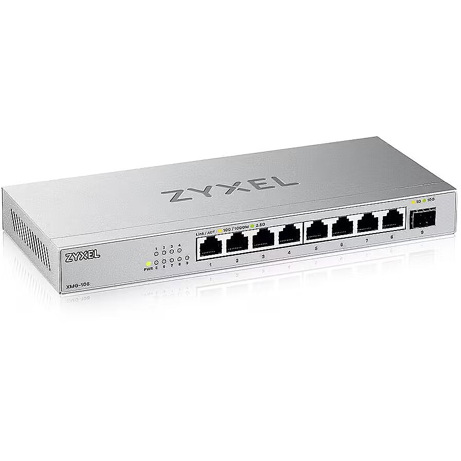LongDesc - The Zyxel XMG-100 Series 2.5 Gigabit switch is the ideal choice for home, SOHO, or small office users who want to upscale their network with increasing demands coming from online gaming activities, multimedia streaming services or faster wireless network connectivity. All ports are equipped with 2.5 Gigabit Ethernet speed, allowing easy network speed upgrade. In addition, this Series offers an extra SFP+ slot for 10G network uplink or access to a NAS.Plug-and-play to upgrade your network to WiFi 6/6E. The XMG-100 Series Switch features Multi-Gig ports supporting speeds up to 2.5G, allowing effortless connection to the latest 2.5G-compatible network devices for high-performance networking. Its simplified plug-and-play technology ensures easy setup to seamlessly upgrade your wireless network to WiFi 6/6E by connecting to the PoE models XMG-105HP and XMG-108HP. Extra 10G port to streamline large file transfers. The 10-Gigabit SFP+ increase the network speed for quicker uploads and downloads through NAS and server, allowing content creators or self-media individuals to work more efficiently. Large files, such as high-resolution videos or images, can be transferred in significantly less time, saving valuable production hours.2.5G Super-Fast Speeds Without Re-cabling.You can use your current Cat 5e cables to upgrade your home networking speed from current 1Gbps to 2.5Gbps without additional cabling fee!Silent Operation, and Flexible Deployment. The XMG-100 Series is built with fanless and sturdy hardware design to ensure all-time silent and stable operation. They are perfect for noise-free environments such as home or studio. The compact design offers flexible mounting options to place the switch on a desktop or mount it to a wall.Accelerate Your Networking Experience. The XMG-100 Series offers home or SOHO users a lag-free and non-intermittent network experience for online gaming or multimedia streaming services. This is achieved through a fast and secure local network connection.