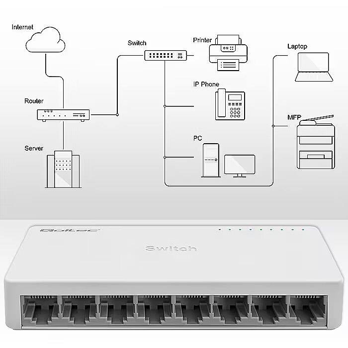 - Equipped with 8 RJ45 ports, each port has an automatic line crossover function,