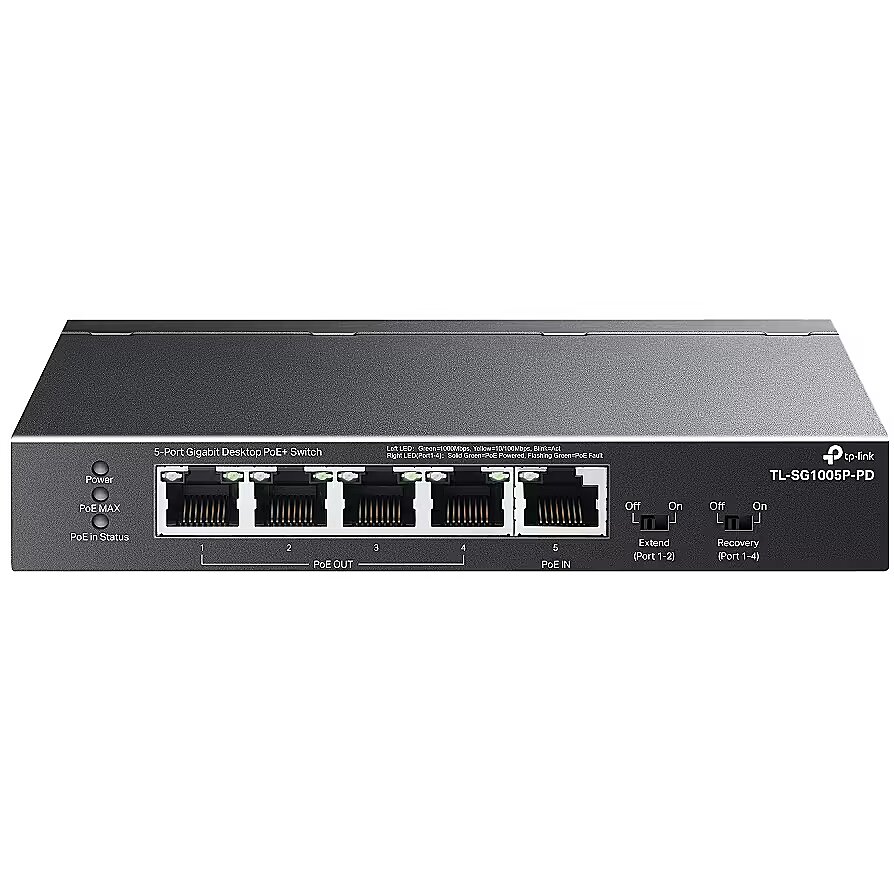 LongDesc - - Ports: 5× 10 Mbps/100 Mbps/1 Gbps RJ45 ports- 1-Port Gigabit PoE++ In and 4-Port PoE+ Out: Supports up to 66 W / 47 W / 21 W/ 9 W PoE budget output when powered by 802.3bt Type 4, 802.3bt Type 3, 802.3at, and 802.3af PoE standard, respectively.*- Long-Range PoE+: With Extend Mode**, PoE transmission distance reaches up to 250 m, perfect for surveillance camera deployment in large areas.- PoE Auto Recovery: It guarantees stable operation of PoE devices by automatically rebooting the dropped or unresponsive PD devices.- Metal Casing: Durable metal casing and desktop/wall-mounting design are well-suited for different environments.- Silent Operation: Industry-leading fanless design ensures silent operation, ideal for any home or business.- Plug and Play: No configuration and installation required.- Power Supply: The product only supports PoE power supply, not AC or DC power supply.Ideal for Mains-Free EnvironmentsPowered by a PoE++ switch or PoE++ injector, no additional DC adapter is required.- Scenarios without mains power- Powered by PoE++/PoE+/PoEPower over Ethernet, Flexible Network DeploymentSupports up to 66W/47W/21W/9W PoE budget output when powered by 802.3bt Type 4 (90 W), 802.3bt Type 3 (60 W), 802.3at, and 802.3af PoE, respectively.* The PoE-PD switch automatically detects the required PoE power for your devices and protects your non-PoE equipment from being damaged. - Access Point- IP Phone- IP Camera- 4K Video- Network Video Recorder- ComputerInstantaneous Multi-mode Toggles, Ideal for IP Surveillance- Extend Mode. Up to 250m Transmissions. With extend mode, the PoE transmission distance reaches up to 250 m** —perfect for IP Camera deployment in large areas.- Recovery Mode. PoE Auto Recovery. Recovery mode helps automatically detect and reboot PD devices, such as cameras and APs, when they fall offline or go unresponsive—all without needing manual monitoring and restarts.
