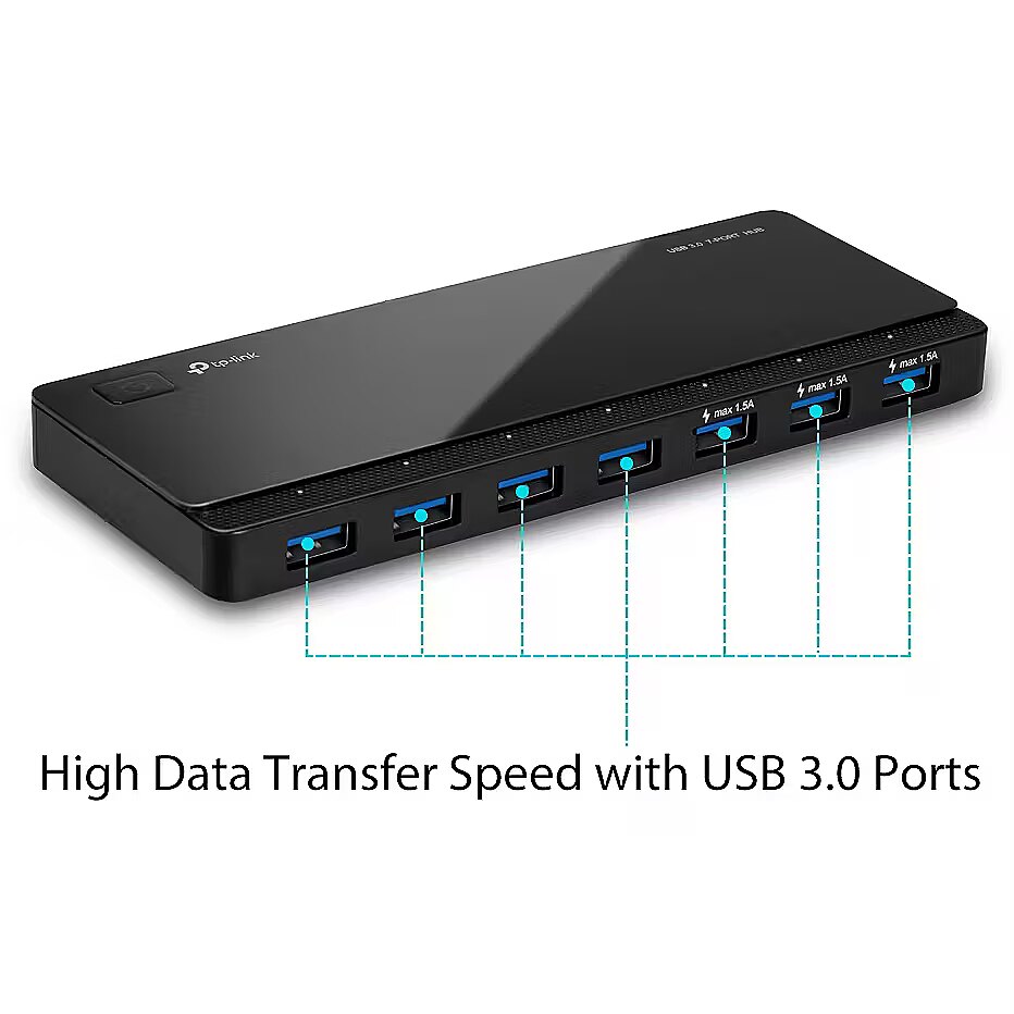 LongDesc - Designed to Charge FastUH700 can deliver up to 5V/1.5A output that charges 50% faster and saves up to 30% on charging time*. Fully charging a Galaxy S6 edge takes just 100 minutes with the UH700 USB Hub, whereas it takes 150 minutes with a USB Hub supporting 5V/1A output10x Data Transfer SpeedEquipped with USB 3.0 ports, the UH700 can transfer a 1080p movie under 2 minutes 18 seconds, whereas it takes 7 minutes 36 seconds with a USB Hub equipped with USB 2.0 ports.Increase the number of available portsThe UH700 is perfect for anyone who has a computer with only one or two USB ports, and wants easier access to additional ports without having to switch between devices.Protect Both Your Devices and Precious DataUH700 has a sophisticated circuit design with multiple protections for your devices against over-heating, over-current, over-voltage and short circuit. A built-in surge protector keeps both your devices and data safe in the process of transferring data. UH700 support USB ports hot swapping that can be safely connected and disconnected while the computer is powered on and running.Considerate DesignA dim white LED indicator on the power button helps visulaize the connection status and similarly 7 dim white LED indicators beyond each USB port also indicate whether the devices are properly connected.