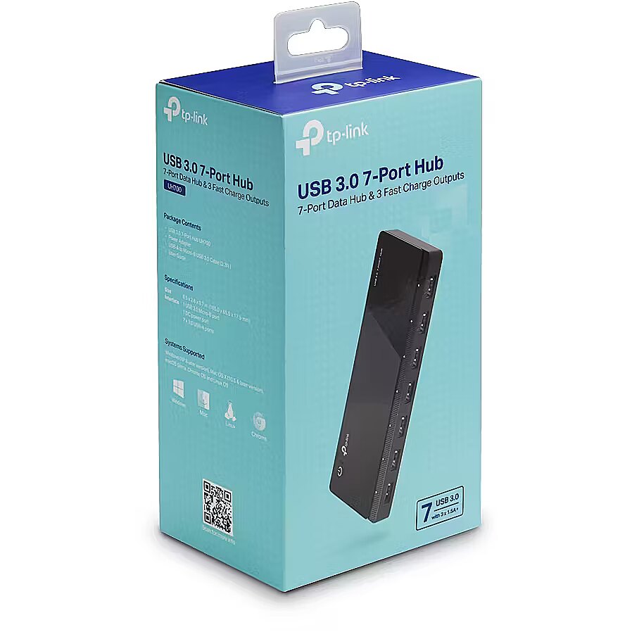 LongSummaryDescription - TP-Link UH700. Host interface: USB 3.2 Gen 1 (3.1 Gen 1) Micro-B, Hub interfaces: USB 3.2 Gen 1 (3.1 Gen 1) Type-A. Data transfer rate: 5000 Mbit/s, Product colour: Black, Cable length: 1 m. Power supply type: USB, Input voltage: 12 V. Width: 165 mm, Depth: 65.5 mm, Height: 17.5 mm