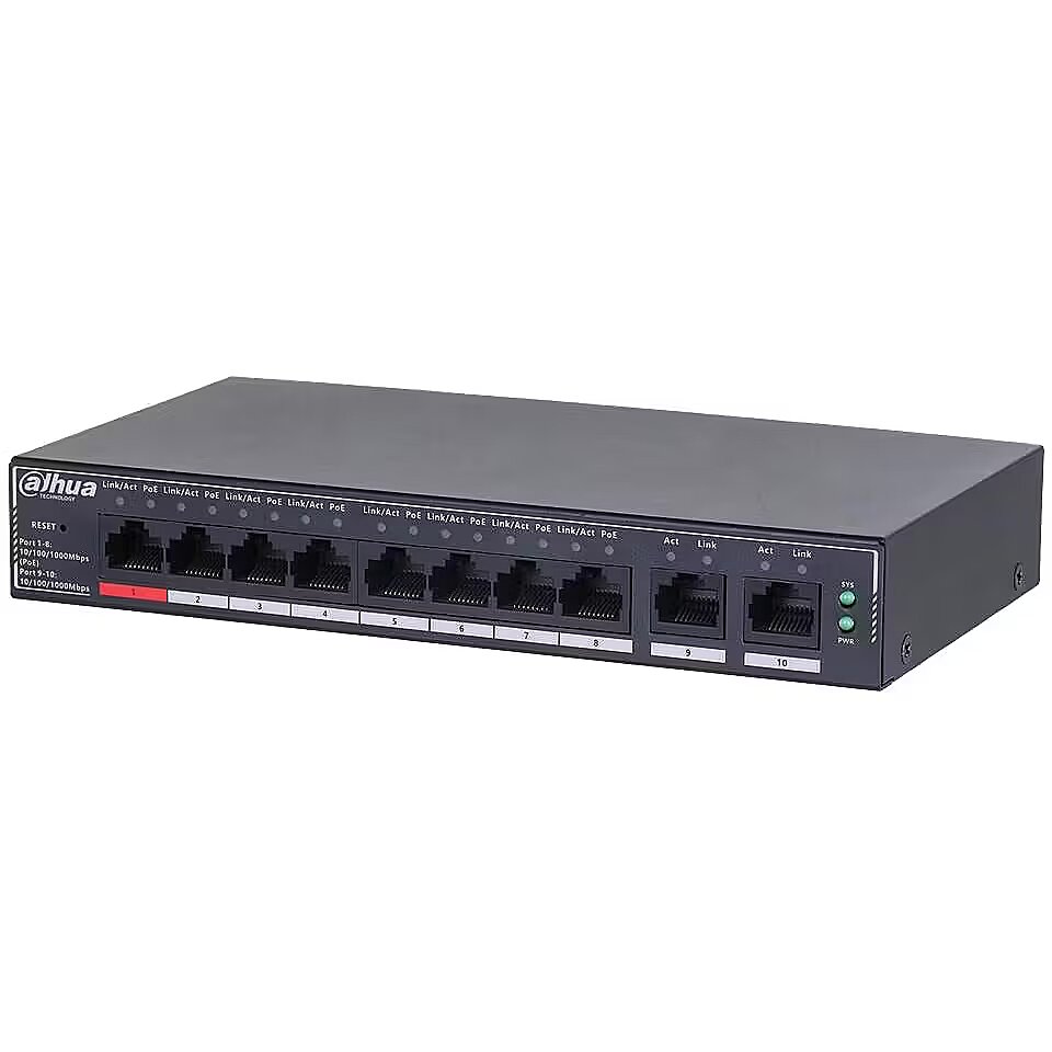 Description - 10-Port Cloud Managed Desktop Gigabit Switch with 8-Port PoE > 8 × RJ45 Gigabit PoE ports, 2 × RJ45 Gigabit ports. > 110 W total PoE budget, 802.3af/at on all PoE ports, additional 802.3 bt on red ports. > Wide operating temperature ranging from –10 °C to 55 °C. Supports VLAN, STP, RSTP and link aggregation. > WEB-managed and centralized cloud management through the DoLynk App and performs real-time monitoring of the network. > Easy config to auto detect and set up network.