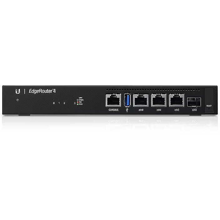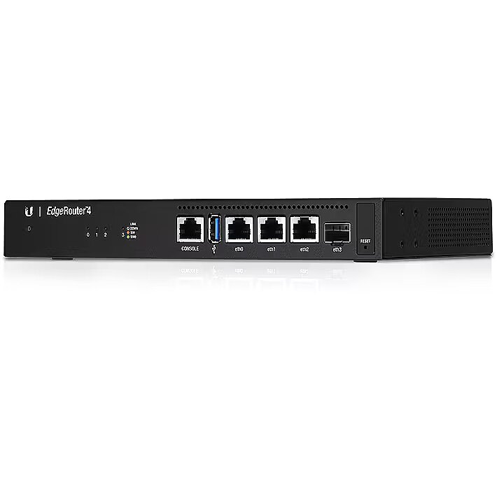 Description - UBIQUITI EdgeRouter 4 (ER-4) The all-new EdgeRouter 4 brings “high-performance at disruptive pricing” to a new level. With a 50% increase in performance compared to the EdgeRouter Pro, the EdgeRouter 4 delivers the performance your network needs. Paired with our feature-rich EdgeOS makes this a versatile tool in both Carrier-Grade and Enterprise networks. New Design (3) 10/100/1000 Mbps Ethernet Ports and (1) SFP Port 4-Core 1GHz MIPS64 Processor Internal PSU Fanless Desk, Wall, and RackMount options