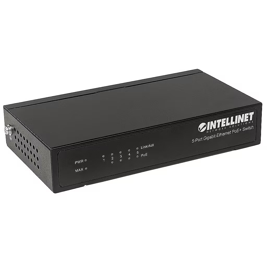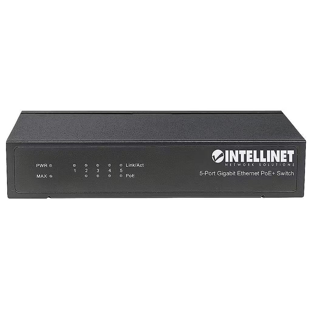 LongDesc - Save installation time and money with PoE. The Intellinet Network Solutions 5-Port Gigabit Ethernet PoE+ Switch passes both data and electrical power to a number of PoE-compatible devices via standard Cat5e or Cat6 network cables. Equipped with five Gigabit Ethernet ports - four of which are high-power PoE+ PSE ports - this switch can power wireless LAN access points and bridges, VoIP phones, IP video cameras and more while delivering network speeds of up to 1000 Mbps. Power over Ethernet 802.3at The Intellinet Network Solutions 5-Port Gigabit Ethernet PoE+ Switch supports the IEEE 802.3at protocol and can inject up to 30 watts of power per port.* IEEE802.3af- or IEEE802.3at-compliant devices attached to the switch require no additional power, which eliminates the time and expense of electrical rewiring and minimises the unsightly clutter caused by power supplies and adapters in awkward places such as ceilings and walls. Any mix of PoE and non-PoE devices is supported, and thanks to its short circuit, overload and high-voltage protection function, your equipment is well-protected. Green Ethernet Technology More often than not, a network switch does not utilize all of its ports at all times. Normally, when a computer, notebook, network printer or other network device powers down, the switch continues to consume the same amount of power as if it were active. To overcome this waste of energy, the Intellinet Network Solutions 5-Port Gigabit PoE+ Switch employs the new energy-efficient IEEE 802.3az technology, which detects link status to all connected devices and reduces the power usage of ports that are not in use. To facilitate maximum network performance, the Intellinet Network Solutions switch adjusts power output based on the length of the network cable that is connected to a particular port. When things slow down, it automatically scales back power usage to conserve energy and save money. * Total PoE budget for this switch is 60 watts. Per-port average power distribution is 15 watts; maximum per-port power usage cannot exceed 30 watts.