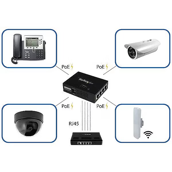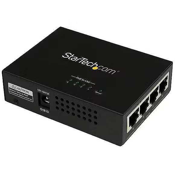 LongDesc - This Gigabit midspan PoE+ injector is a cost-effective alternative to upgrading your existing network switch to a PoE-capable model.It supplies up to 30 Watts output to each port, so you can easily power and access up to four high-power PoE-compliant devices — such as IP cameras — using standard Ethernet cable.More power, with less cost and hassleThis versatile midspan PoE+ injector is suited for almost all PoE device classes, including wireless access points, as well as IP phones and cameras. The high-power PoE+ injector offers 120W total power distribution and delivers full power — up to 30.8W — from each port. Now, you can easily scale and power your PoE+ devices across long distances, even in remote locations where a typical power outlet is unavailable.Plus, the cost-effective Power over Ethernet+ injector lets you connect your PoE-powered devices (PDs) to a non-PoE-capable switch, avoiding the expense and aggravation of upgrading your existing switch to a PoE-enabled model.Easy to set up in mixed environmentsThis injector is the perfect solution for a variety of environments. It features a wall-mountable rugged metal casing, but is palm-sized making it perfect for desktop placement too.With plug-and-play operation, you can enjoy fast and hassle-free setup without disrupting your workflow.Convenient, protected connectionsNot sure which class your PoE devices are? The Gigabit midspan PoE+ injector automatically detects the power requirements of your PoE PDs, and delivers the appropriate level of power without damaging your devices.With integrated circuit protection between each port, your devices are also protected from power interference.The POEINJ4G is backed by a StarTech.com 2-year warranty and free lifetime technical support.