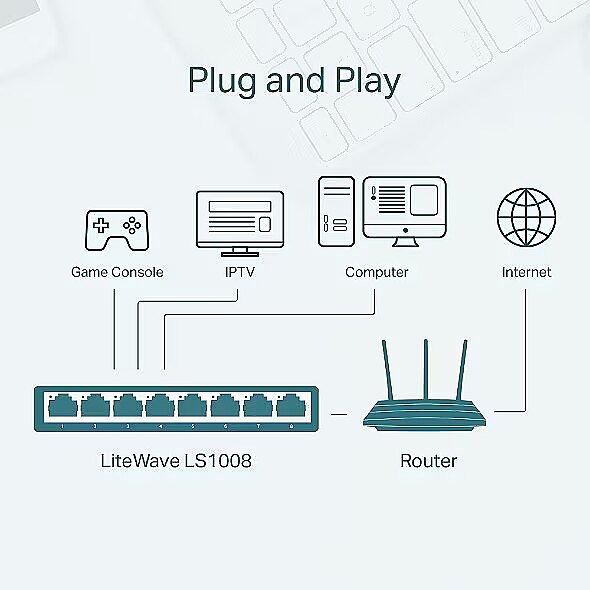 LongDesc - The TP-Link LiteWave Series Unmanaged Switches provide easy and affordable way to expand your wired network. They are easy to use and reliable. With these plug-and-play switches, you can expand your network connections to multiple devices instantly. With all ports support Auto-MDI/MDIX, there’s no need to worry about the type of cable to use.Go Green with Your EthernetThe LiteWave Series also supports energy-efficient technology, helping you save power and money. Power consumption automatically adjusts according to link status and cable length, allowing you to expand your network while minimizing your carbon footprint. Save the planet and lower your energy bills — it’s a win-win!Fanless and Desktop DesignCompact desktop design, to meet your needs in any environment.Besides, fanless design ensures quiet operation.Use Where You Need, However You NeedThe LS1008 is fully compatible with networked devices such as computers, printers, webcams, IPTVs. It has a wide range of application scenarios and is suitable for networking in school dormitories, surveillance, homes, and small businesses.