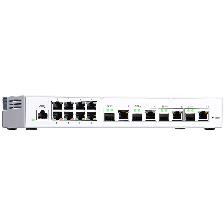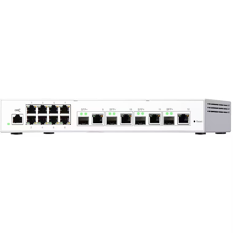 LongDesc - The QSW-M408-4C is a Layer 2 Web Managed Switch equipped with four 10GbE SFP+/RJ45 combo ports and eight Gigabit ports. Supporting Layer 2 switching and network management via a user-friendly web user interface, the QSW-M408-4C offers flexible deployment in hybrid high-speed network environments and provides an entry-level network management solution that is usable even by non-IT professionals. The QSW-M408-4C is compatible with 10GbE and NBASE-T technologies that supports up to five speeds (10G / 5G / 2.5G / 1G / 100M) to provide higher transmission speeds with existing Cat 5e and 6a cables. With its high performance, user-friendly management features and desktop size, the QSW-M408-4C allows you to instantly upgrade to a hybrid high-speed network environment at a cost-effective price, while optimizing network bandwidth and ensuring network maintenance security.Flexible deployment with multiple 10G SFP+ fiber and Gigabit portsThe QSW-M408-4C provides four 10GbE SFP+/RJ45 combo ports and eight Gigabit ports for connecting various devices and enabling hybrid high-speed networks. With SFP+ interfaces, direct attach copper (DAC) cables can be used for connecting directly to SFP+ devices. You can also use RJ45 ports to connect 10GBASE-T/NBASE-T devices through RJ45 Category 6, 5 or 5e cabling. The switching capacity of QSW-M408-4C is 96Gbps, guaranteeing the full potential of each port.QSS: Intuitive Network Management Software with Web GUIThe QSW-M408-4C uses the QNAP Switch System (QSS), which features an easy-to-use Web GUI with value-added functions to simplify network set up and management.Sleek DesignUse the at-a-glance major functions, flat control layers and one-click login to simplify set up and management.GUIThe visual illustration matches physical ports for greater usability.Value-added FunctionsWith the setting guide, status chart reference, online firmware update, the learning and management costs are greatly reduced.QSS: The human-centered setting guideQNAP Switch System (QSS) provides an overview dashboard, port management and setting guide to help administrators control Layer 2 networks.Optimize Network Performance with bandwidth and packet controlThe QSW-M408-4C provides bandwidth and packet control functions (such as LACP, VLAN, QoS, and IGMP Snooping) for boosting network performance through IP grouping and bandwidth management.Powerful security and system functionsThe QSW-M408-4C has powerful security and system functions (including ACL, LLDP, RSTP and Flow Control) to help administrators enhance network reliability using access controls, troubleshooting, loop prevention and avoiding packet loss.Faster speeds using existing cables with 10GBASE-T & NBASE-TThe QSW-M408-4C is compatible with 10GbE and NBASE-T technologies to support up to five speeds (10G / 5G / 2.5G / 1G / 100M). The SFP+/RJ45 (copper) combo ports provide higher transmission speeds with existing cables. Depending on cable types and their lengths, different speeds can be achieved for faster, more efficient data transfer.Improve team productivity with a 5GbE/ 10GbE High-Speed NetworkFrom NAS with built-in 10GbE SFP+ and 10GBASE-T ports, or NAS with PCIe slots that support 10GbE/5GbE/2.5GbE network adapters, QNAP has led the industry in 10GbE adoption. Other high-speed network solutions from QNAP include Thunderbolt 3 to 10GbE Network Adapters and USB 3.2 Gen 1 to 5GbE Network Adapters. These can all be used with the QSW-M408-4C to create a comprehensive high-speed network environment for boosting the performance of photo/video editing, virtualization, large-file data transfers, and other bandwidth-demanding tasks.Desktop size for easy use in officesWith a compact and modern design, the QSW-M408-4C fits perfectly alongside other devices in modern digital offices. Featuring a delicate white or textured surface design, the QSW-M408-4C helps users to easily identify each port. The flexible DC power connector also assists in universally deploying the QSW-M408-4C. Being fully plug-and-play, simply connect the QSW-M408-4C to your devices and it will do the rest.