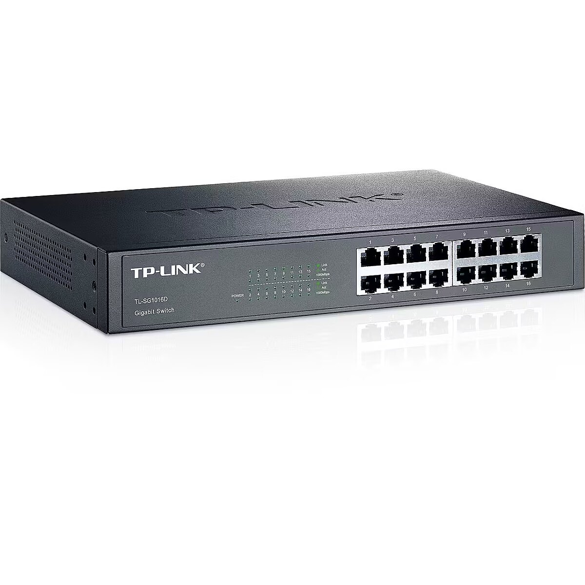 Description - TP-LINK TL-SG1016D + 16 10/100/1000Mbps ports + Innovative energy-efficient technology saves power up to 40% + Supports MAC address self-learning, Auto MDI/MDIX and Auto negotiation + Plug & play design
