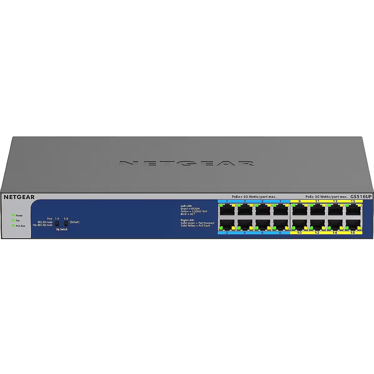 LongDesc - Instant Connectivity and Reliable PerformanceThe NETGEAR Gigabit Unmanaged Switch series helps your business cost-effectively expand your network to Gigabit speeds and higher port counts. The GS516UP joins the series and offers 8 Ultra60 PoE++ ports and 8 PoE+ ports to power high-power PoE devices. With a total PoE power budget of 380W, deploy denser PoE+ and PoE++ devices to a single switch rather than multiple.The GS516UP is energy efficient, built to last, and rigorously tested to provide the reliability your business needs. 802.1p traffic prioritization and jumbo frame support allow for seamless integration with more sophisticated networks.Powerful Ultra60 PoE++Ideal for powering and connecting 802.11AX wireless access points, 4K/8K IP surveillance cameras, PoE lighting, and high power audio speakers, the GS516UP gives you a highly cost-effective and powerful switch with the best cost/PoE budget ratio. NETGEAR Ultra60 PoE++ Unmanaged Switches support the latest Energy Efficient Ethernet (IEEE 802.3bt) standard, powerful enough to support devices that require greater power.The GS516UP includes 8 UltraPoE++ ports that can deliver up to 60W of power per port.PoE ModeYour business is always changing and growing, but not all your devices may be 802.3bt standard compatible. PoE mode on the GS516UP solves this problem by providing power to both pre-bt and bt standard devices. - GS516UP by default uses 802.3bt standard, only compatible for bt standard devices- 802.3bt Standard Devices: to power bt standard devices, select 802.3bt mode to receive 60W of power- Pre-802.3bt Standard Devices: to power up pre-802.3bt standard products, select the pre-802.3bt mode to receive more than 30W of power- If the GS516UP is set to pre-802.3bt mode but the device is standard 802.3bt, then PoE++ power will not be delivered to the device. The switch will only deliver 802.3af (LongProductName - 16-Port Gigabit Ethernet High-Power POE+ Unmanaged Switch With POE++ Ports