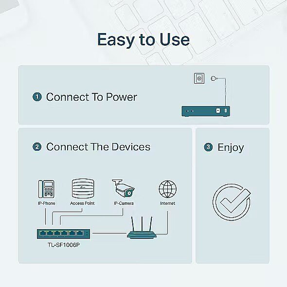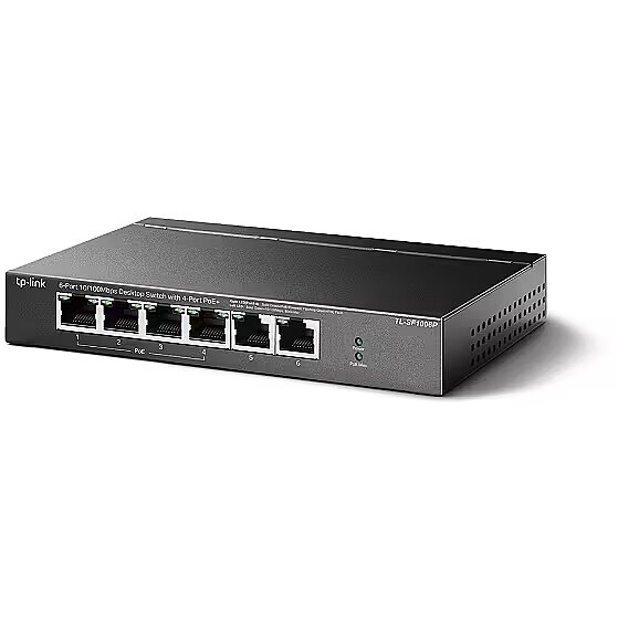 LongDesc - Professional High-Power Switch with 4 PoE+ PortsPlug and Play, with PoE Transmission for Surveillance up to 250 mDedicated 4-Poart PoE+ Switch (67 W Budget) for Numerous ApplicationsCompliance with the 802.3af/at PoE standard supports up to 15.4 W on each PoE port. The total 41 W PoE power budget* for the 4× PoE ports opens up a wide range of applications, such as surveillance for offices, dormitories, and small businesses. It is fully compatible with IP cameras, access points, IP phones, computers, printers, and more.Ideal for IP Surveillance—Up to 250 m TransmissionsWith extend mode, the PoE transmission distance reaches up to 250 m**—perfect for IP Camera deployment in large areas.**The speed of the ports in extend mode will downgrade to 10 Mbps. The actual transmission distance may vary due to power consumption of PoE-powered devices or the cable quality and type.Priority Video Quality GuaranteedQuality of sensitive applications like video monitoring in critical business areas is guaranteed by offering higher priority options for ports 1–2 when one-touch Priority Mode is on.Intelligent Power ManagementWhen total power consumption exceeds 67 W, the intelligent power management will cut the lower priority port power. This ensures the high priority port’s power supply and protects the device from power overload. It also automatically detects and provides the required power for your PoE devices while protecting your PoE and non-PoE equipment from being damaged.Durable Metal CasingThe interior components of TL-SF1006P are protected by high-quality metal casing to ensure a long product life. Having passed an array of stringent reliability tests, TL-SF1006P delivers switching performance you can depend on.