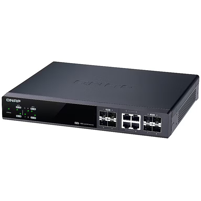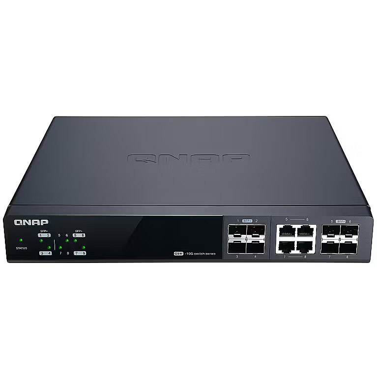 LongDesc - The QSW-M804-4C is a Layer 2 Web Managed Switch with four 10GbE SFP+ ports and four 10GbE SFP+/RJ45 combo ports that enables blazing-fast transfer speeds, simultaneous multi-workstation access to large files (ideal for video editing and multimedia), and empowers bandwidth-demanding tasks like virtualization. Supporting Layer 2 switching and providing a user-friendly entry-level network management solution, the QSW-M804-4C is an affordable way for businesses and organizations to fully embrace 10GbE connectivity.Flexible deployment combo ports and 10GbE / NBASE-TThe 8-port QSW-M804-4C switch includes four SFP+ (fiber) ports, and four SFP+/RJ45 (copper) combo ports for connecting different interfaces. With RJ45 interfaces, 10GbE is supported using Cat 6a (or above) cables. Direct Attach Copper (DAC) cables can be used with SFP+ ports for connecting to servers inside a rack. The switching capacity of the QSW-M804-4C is 240 Gbps, guaranteeing the full potential of each port. The QSW-M804-4C is also compatible with 10GbE and NBASE-T technologies to support up to five speeds (10G / 5G / 2.5G / 1G / 100M). The SFP+/RJ45 (copper) combo ports provide higher transmission speeds with existing cables. Depending on cable types and their lengths, different speeds can be achieved for faster, more efficient data transfer.Fully embrace High-Speed Networking with QNAP!From NAS with built-in 10GbE SFP+ and 10GBASE-T ports, or NAS with PCIe slots that support 10GbE network adapters, QNAP has led the industry in 10GbE adoption. Other high-speed network solutions from QNAP include Thunderbolt 3 to 10GbE Network Adapters and USB 3.2 Gen 1 to 5GbE Network Adapters. These can all be used with the QSW-M804-4C to create a comprehensive high-speed network environment for boosting the performance of photo/video editing, virtualization, large-file data transfers, and other bandwidth-demanding tasks.QSS: Intuitive Network Management SoftwareThe QNAP Switch System (QSS) features an easy-to-use Web GUI with value-added functions to simplify network set up and management.Sleek DesignUse the at-a-glance major functions, flat control layers and one-click login to simplify set up and management.GUIThe visual illustration matches physical ports for greater usability.Value-addedWith the settings guide, status chart reference, online firmware update, learning and management costs are greatly reduced.Optimize Network Performance with bandwidth and packet controlThe QSW-M804-4C provides bandwidth and packet control functions (such as LACP, VLAN, QoS, and IGMP Snooping) to boost network performance through IP grouping and bandwidth management.Powerful security and system functionsThe QSW-M804-4C has powerful security and system functions (including ACL, LLDP, RSTP and Flow Control) to help administrators enhance network reliability using access controls, troubleshooting, loop prevention and avoiding packet loss.Near-silent and energy savingWith its smart cooling system, the QSW-M804-4C ensures high-speed network performance without distracting background noise. IEEE 802.3az (EEE) support also reduces power consumption without sacrificing performance or functionality. By dynamically detecting link speeds and activities and adjusting accordingly, the QSW-M804-4C provides energy savings of up to 50% to minimize operational costs.Versatile installation and sleek appearanceThe QSW-M804-4C features a sleek modern design that blends in with modern digital homes and offices. A Rackmount Kit is included to provide extra installation options.