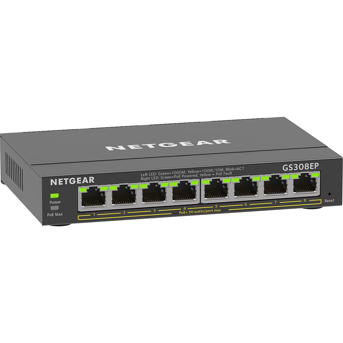 LongSummaryDescription - NETGEAR 8-Port Gigabit Ethernet PoE+ Plus Switch (GS308EP). Switch type: Managed, Switch layer: L2/L3. Basic switching RJ-45 Ethernet ports type: Gigabit Ethernet (10/100/1000), Basic switching RJ-45 Ethernet ports quantity: 8. Full duplex. MAC address table: 4000 entries, Switching capacity: 16 Gbit/s. Networking standards: IEEE 802.3, IEEE 802.3ab, IEEE 802.3u, IEEE 802.3x, IEEE 802.3at, IEEE 802.3af. Power over Ethernet (PoE)