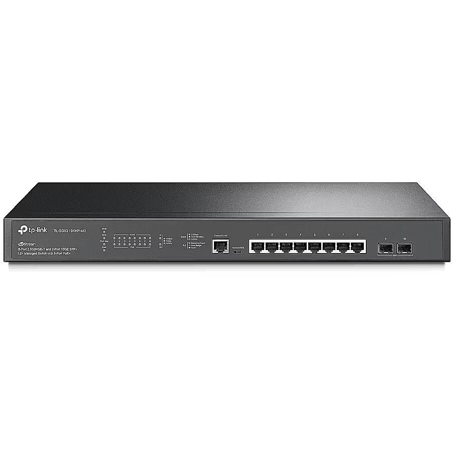 Description - JetStream 8-Port 2.5GBASE-T and 2-Port 10GE SFP+ L2+ Managed Switch with 8-Port PoE+ 2.5G PoE+ Ports for WiFi 6: 8× 2.5 Gbps ports smash the gigabit barrier and unlock the full potential of WiFi 6 APs. 10G Lightning-Fast Uplink: 2× 10 Gbps SFP+ slots enable high-bandwidth connectivity and non-blocking switching capacity. 240 W PoE Budget: 8× 802.3at/af-compliant PoE+ ports with a total power supply of 240 W*. Integrated into Omada SDN: Zero-Touch Provisioning (ZTP)**, Centralized Cloud Management, and Intelligent Monitoring. Centralized Management: Cloud access and Omada app for ultra convenience and easy management. Static Routing: Helps route internal traffic for more efficient use of network resources. Robust Security Strategies: IP-MAC-Port Binding, ACL, Port Security, DoS Defend, Storm control, DHCP Snooping, 802.1X, Radius Authentication, and more. Optimize Voice and Video Applications: L2/L3/L4 QoS and IGMP snooping.
