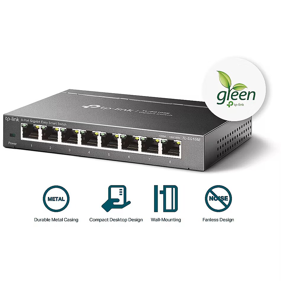 LongDesc - Easily Expand Your Gigabit Network and Save Energy8-Port Gigabit Easy Smart SwitchLink Your Devices, Create Convenient BusinessThe 8-Port Gigabit Easy Smart Desktop Switch provides an easy way to expand your wired network. Deal with your business quickly and easily, whether you are at home or in the office.Gigabit Ports for Maximum Speed8 non-blocking 10/100/1,000 Mbps ports make it possible to transfer large, bandwidth-intensive files with no interference.More Features,More Choices- QoS for a Lag-Free ExperienceEnsures smooth traffic for latency sensitive applications, such as voice and video- IGMP Snooping for Multicast OptimizationEnsures a better network experience, especially for applications like IPTV, by optimizing multimedia traffic delivery.- VLAN for SecurityHelps to create network with higher security and better overall performance by dividing network into smaller groupsManagement Made EasyTL-SG108E offers network monitoring for users to observe traffic behavior. Through its web-based user interface and management utility, the TL-SG108E offers a variety of useful features, including network monitoring, traffic prioritization, and enhanced QoS.Durable Metal CasingThe interior components of TL-SG108E are protected by high-quality metal casing to ensure a long product life. Having passed an array of stringent reliability tests, TL-SG108E delivers switching performance you can depend on.Go Green with Your EthernetTP-Link’s latest generation of Easy Smart Switches make use of innovative energy-saving technologies. Power consumption automatically adjusts according to link status and cable length, allowing you to expand your network while minimizing your carbon footprint. Save the planet and lower your energy bills — it’s a win-win!
