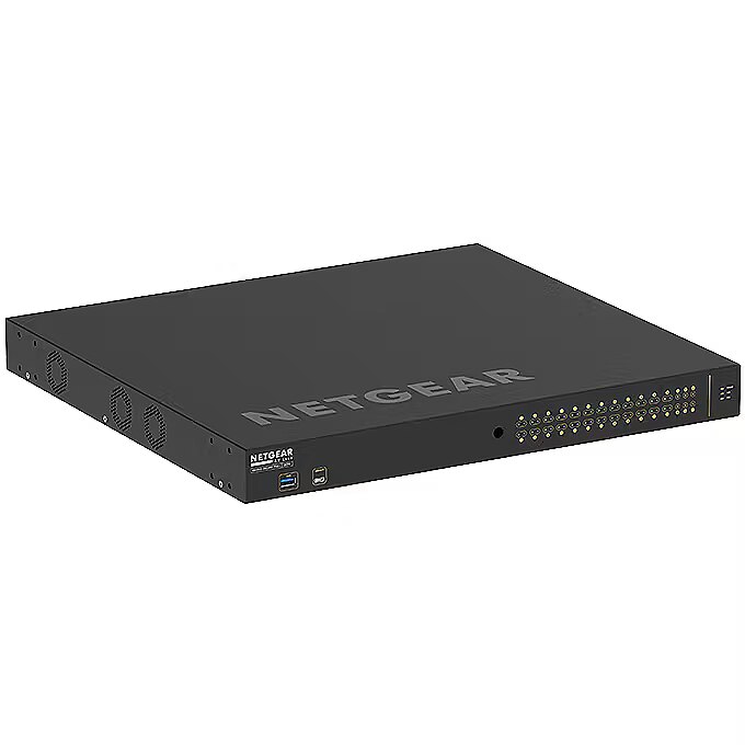 Description - M4250-26G4XF-PoE+ (GSM4230PX)  24x1G PoE+ 480W 2x1G and 4xSFP+ managed switch Switching designed for AV over IP 1 G technology with back-to-back ports for clean integration into AV racks. Pre-configured for operation out of the box! Ground-breaking graphical user interface Simplified user interface makes it easy to assign configuration profiles to each port. Instant group broadcasting The NETGEAR IGMP Plus feature enables group broadcasting immediately after unpacking for most AV over IP applications. Sleek, quiet design Lower fan noise and included mounting ears for under-table or wall installation. Auto-configuration Auto-trunk and auto-LAG function automatically connects to other M4250 (and M4300) switches. Quick, easy - configuration for audiovisual professionals Streamlined interface allows individual ports to be assigned AV factory defaults or user-specified AV profiles in just a few clicks Focus on the event - no fan noise Most models have a silent mode that significantly reduces fan noise, and some models are even fanless. Audio and video over IP - right out of the box With NETGEAR IGMP Plus technology built-in, video over IP configuration is unnecessary. Enable multicasting right out of the box. Sophisticated design - allows installation Clean lines and port activity status are shown on the front of the switch, and cabling is neat on the back. Universal mounting options allow mounting in a VESA rack or standard rack cabinets.