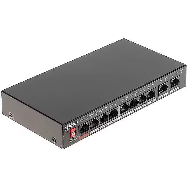 LongDesc - System OverviewDH-PFS3010-8ET-96 is an unmanaged Desktop Switch with 8 × 10/100Mbps PoE Ports. It provides 8 × 10/100 Mbps Ethernet ports and 2 × 10/100/1000 Mbps uplink ports. The product is equipped with two types of transmission modes (Extend Mode On/Extend Mode Off). The red port supports the IEEE802.3bt and the Hi-PoE standards. The maximum power consumption is 90W. It also supports PoE watchdog to avoid manually maintenance and device restart, which can realize the intelligent management and reduce the cost.Intelligent PoEAdopt PoE power consumption management strategy, and supply power to important ports first. When total power consumption exceeds the set threshold value of the system, power down the ports from large port number to small port number. Adopt smart detection to prevent outage. Supply power with ultra-wide power range, and adapt to IPC power consumption fluctuations in severe environment.BT 90WThe red port supports the IEEE802.3bt and the Hi-PoE standards. The maximum power consumption is 90 W.PoE WatchdogAdopt the PoE watchdog function to avoid manually maintenance and device restart, which can realize the intelligent management and reduce the cost.Long Distance PoEBreaking the IEEE 100 m transmission limit, the device supports 250 m long distance PoE transmission with a more flexible networking.8-pin Assignment PoE Power SupplyThe Eight-PIN Ethernet port supports power supply, to enhance frontend and rear-end compatibility. Reduce cable loss and promote loading capacity.SceneThe device is applicable for use in different scenarios, including home, office, server farm, and small mall.