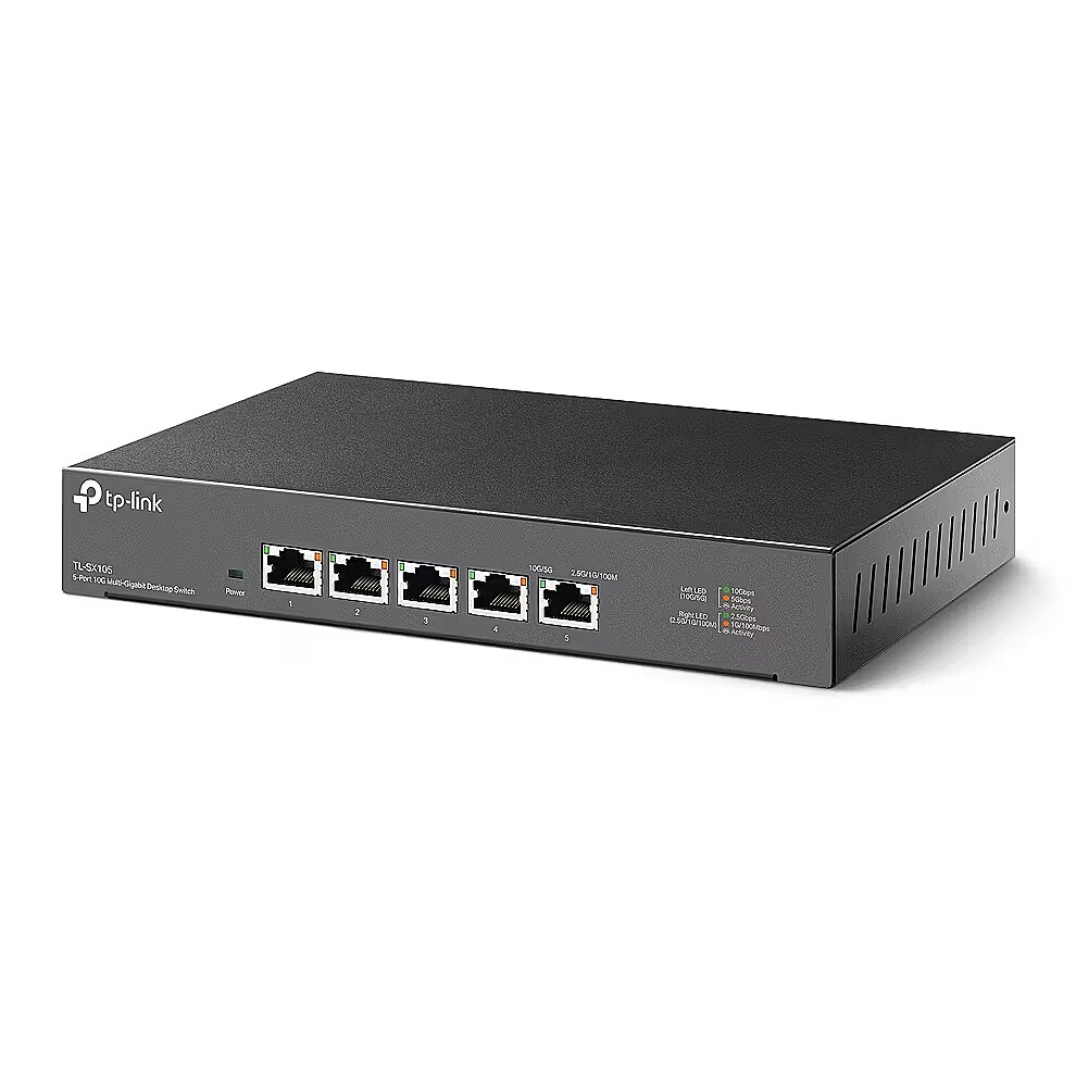 LongDesc - Futuristic Networking with Lightning-Fast 10G Connections5-Port 10G Desktop SwitchUnlock the Highest Performance of10G/Multi-Gig Bandwidth and DevicesAs the flagship 10G product, TL-SX105 is a 5-port 10G desktop switch, providing up to 100 Gbps of switching capacity. Auto-negotiation 5-speed (100Mbps/1G/2.5G/5G/10G) connections sense the link speeds and intelligently adjust for compatibility and optimal performance for all your devices, including 10G NAS, 10G server, workstation, gaming computer, 2.5G/5G/10G WiFi 6 AP, 8K video, desktop, and more.Ready for Immediate Network Upgrading to 10G?Reliable, lightning-fast connections and the lowest possible latency make it ideal for gaming and small office and home office use.LAN PartyNever host a laggy LAN party again. Experience the unparalleled speed and let the game run smoothly.Home EntertainmentEnjoy a fun game time and 8K videos with friends and family, without having to ever worry about buffering again.Small and Home OfficesWork at office or home with lightning-fast connections to workstations and WiFi 6 access points.Instant Transfer for WorkstationsImmediately back up and store computer files to NAS storage with increased transfer speeds, never waste time.Built for Smooth LAN PartiesNever host a laggy LAN party again. Experience the unparalleled speed and lower latency, and prioritize gaming traffic with QoS. Let’s begin the unprecedented smooth game!Ideal for Home EntertainmentEnjoy Buffer-Free 8K VideosEnjoy buffer-free multi-channel 8K videos with friends and family for movie nights with maximum entertainment.More 10GE LAN Ports for WiFi 6 NetworkingExpand the 10GE LAN ports of your WiFi 6 routers and connect more devices—all running at max 10 Gbps.Lightning-Fast Connections for Business and Home OfficeWork at office or home with lightning-fast connections to workstations, desktop computers, and WiFi 6 access points.Silent Operation withIndustry-Leading Fanless DesignThe revolutionary fanless design ensures unprecedented silent operation, ideal for any home or business. Durable metal casing, desktop/wall-mounting design and professional heat dissipation design are well-suited for different environments.Just Plug and Play for Internet AccessA plug-and-play design allows for easy deployment without the need for a technician. Auto MDI/MDIX eliminates the need for crossover cables.Flexible Deployment OptionsThe versatile mounting system gives you the flexibility to place the 10G switch on a desktop or mount it to a wall.Same Cables, New SpeedDesigned to integrate flawlessly into existing gigabit Ethernet network infrastructures, guaranteeing speeds 5× faster§ using standard Cat5e Ethernet cables—no Cat6 wiring needed. With Cat6a or higher rated cables, 10G connections are built up to 100 meters (328 feet).