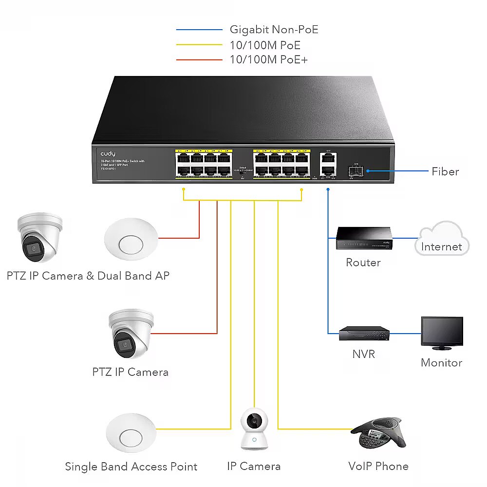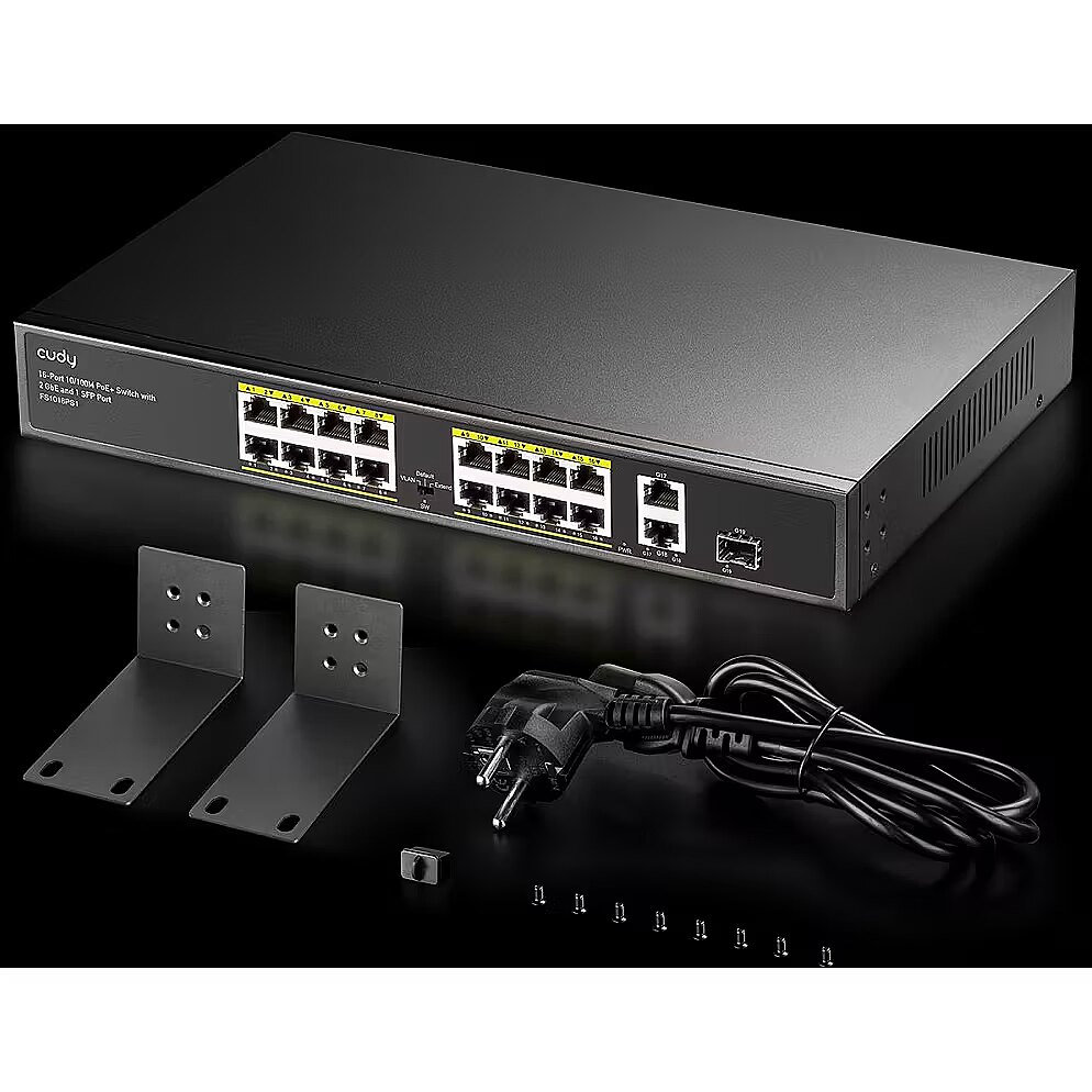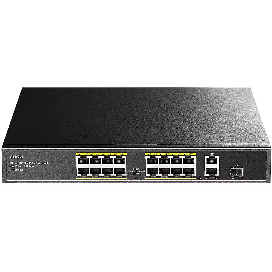 Description - FS1018PS1 16-Port 10/100M PoE+ Switch with 1 Combo SFP Port 200W PoE power, up to 30W per port 2 10/100/1000M uplink ports + 1 SFP port 16 10/100M PoE+ ports CCTV mode supports remote PoE power up to 250m VLAN mode isolates each PoE port for security IEEE 802.3at / IEEE 802.3af compliant Plug&Play
