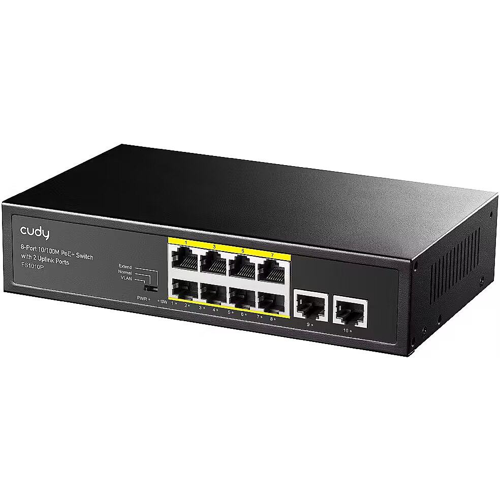 Description - FS1010P 8-Port 10/100M PoE+ Switch with 2 Uplink Ports Supports IEEE802.3at and IEEE802.3af Total PoE output power 120W, up to 32W for one PoE port Support IEEE802.3x full duplex and half duplex flow control Support VLAN and CCTV functions Panel LEDs to monitor operating status and assist in fault analysis Perfect security mechanism